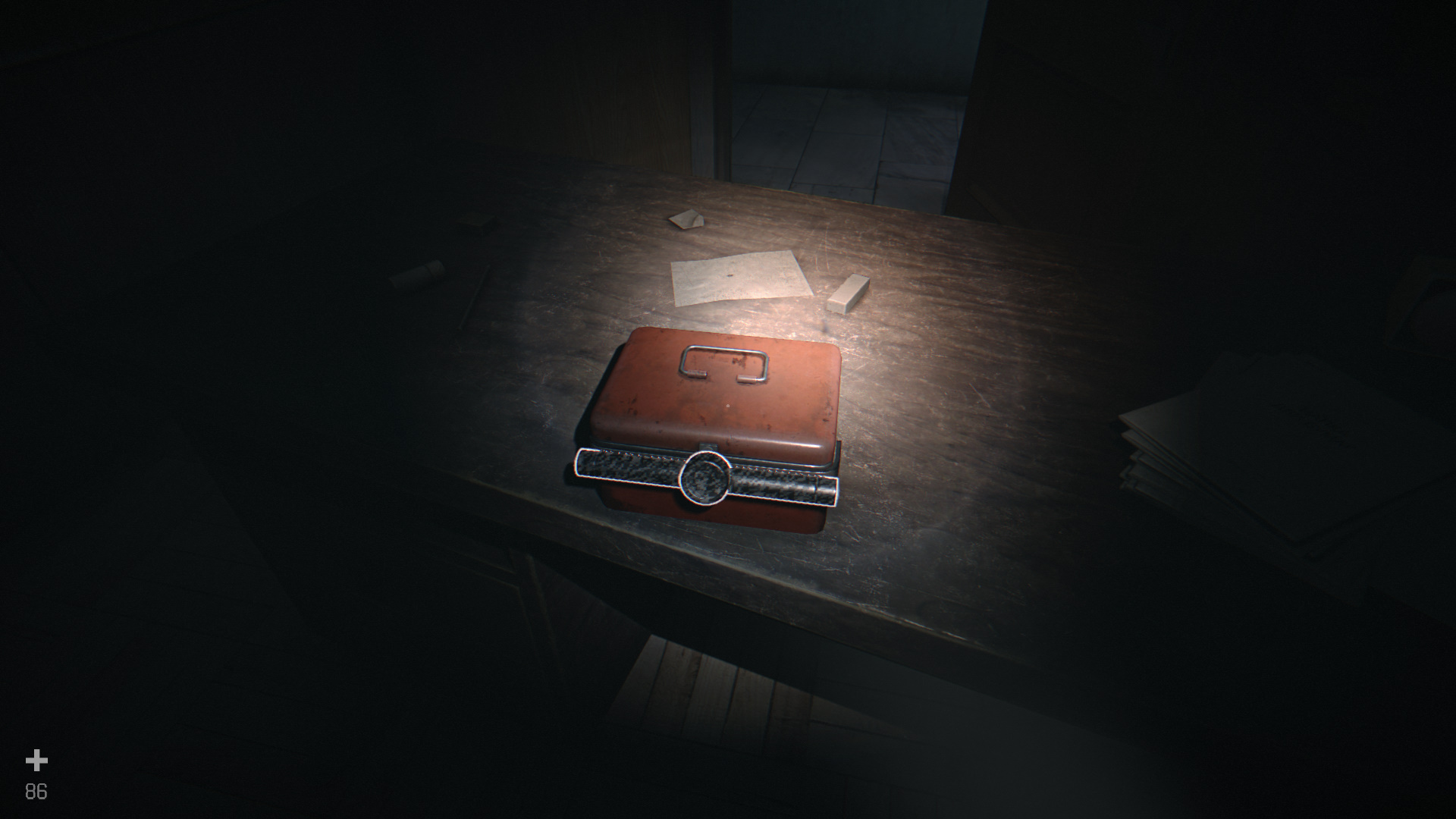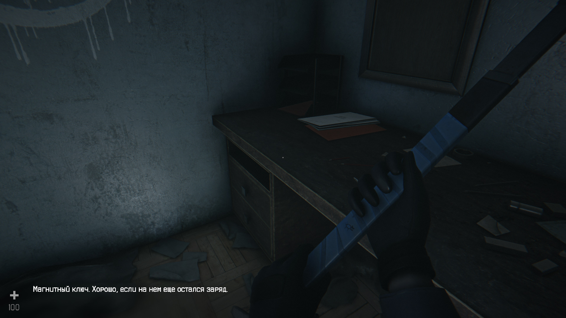 После вступительной кат-сцены нажмите на TAB, чтобы ознакомиться с инвентарем. Спуститесь на нижний этаж и войдите в комнату в углу. В верхнем выдвижном ящике стола ищите магнитный ключ.