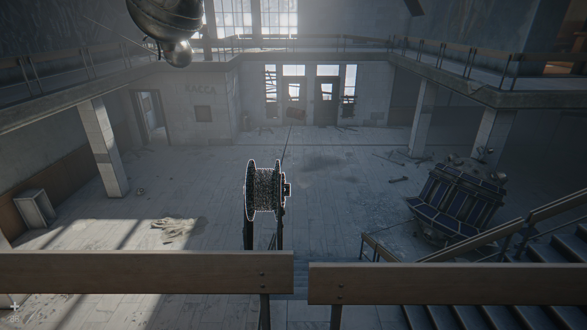 Двигайтесь в самое начало, в холл с красной бочкой на тросе. Вверху ищите механизм лебедки. Примените рукоять и двигайте мышь по часовой стрелке, пока трос не порвется. Бочка пробьет выход наружу.
