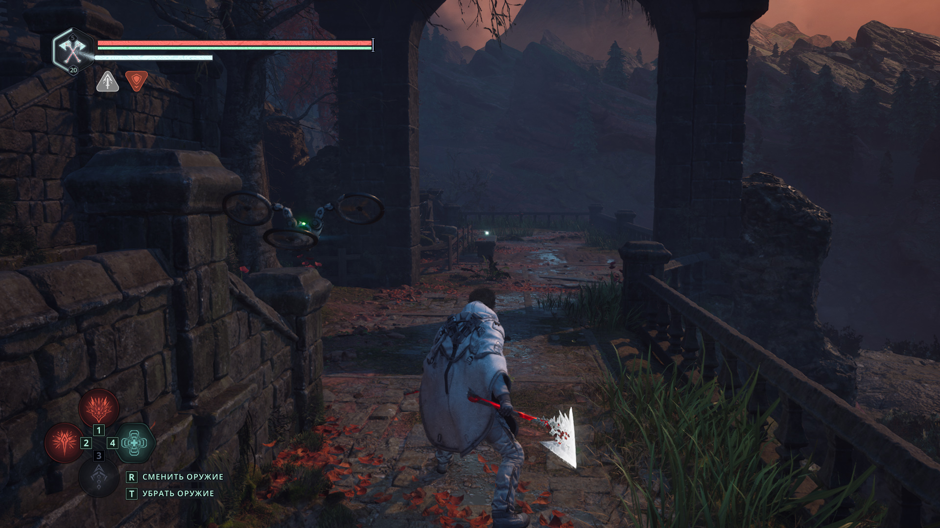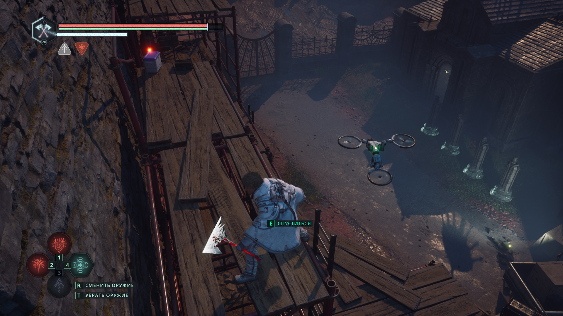 Вернитесь туда, где поворачивали последние статуи (у подъемного крана). Вновь используйте кран, чтобы поднять мостик вверх. Пройдите на территорию склепа со статуями через теперь уже открывшиеся ворота. Следуйте на строительные леса и убейте монстра вверху, который стреляет издали. Если зачистили локацию снизу и площадку неподалеку, парень с крыши поблагодарит, а благое дело «Разделенные» будет совершено. Также можете подобрать кепку «Квебек».