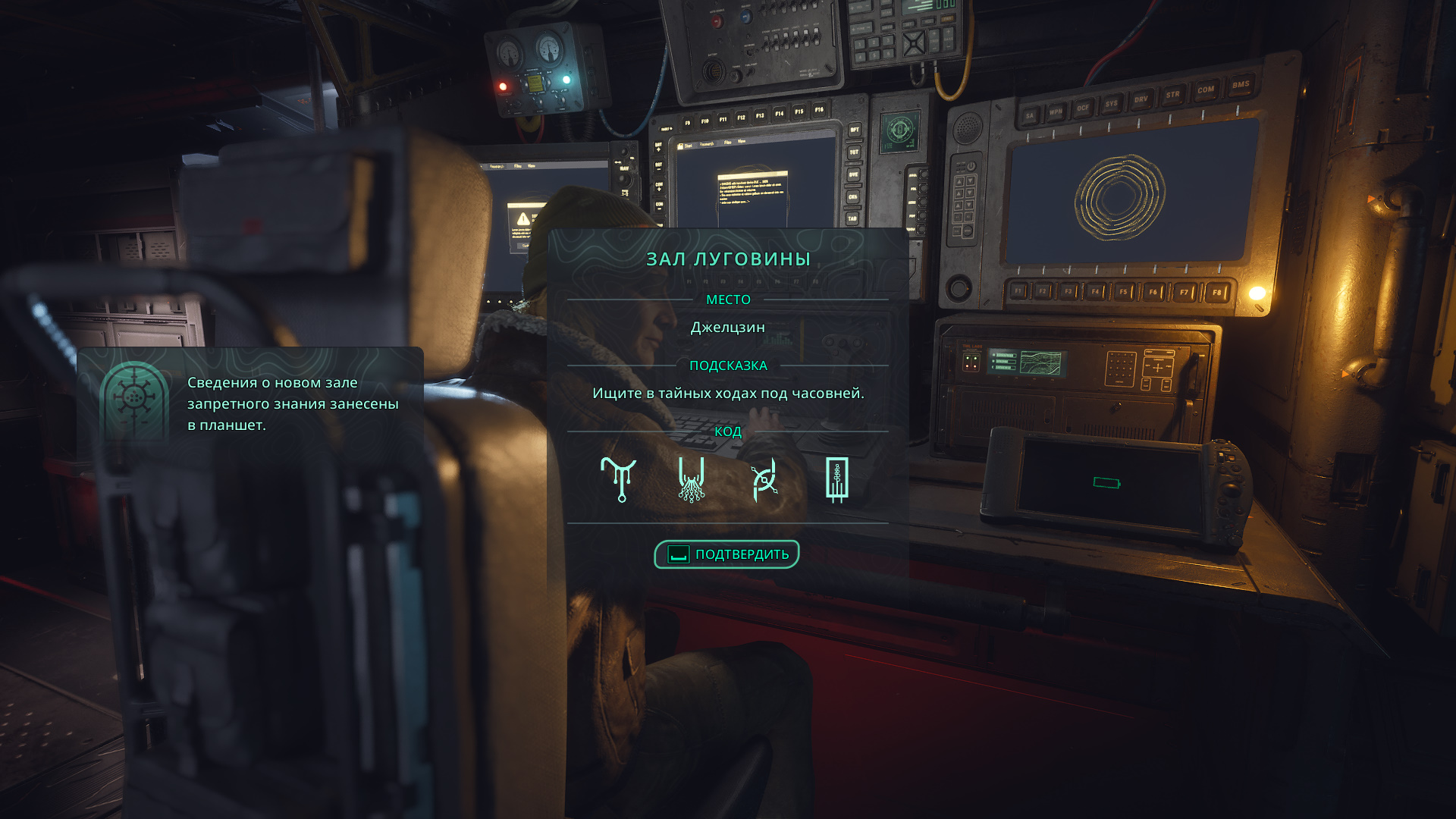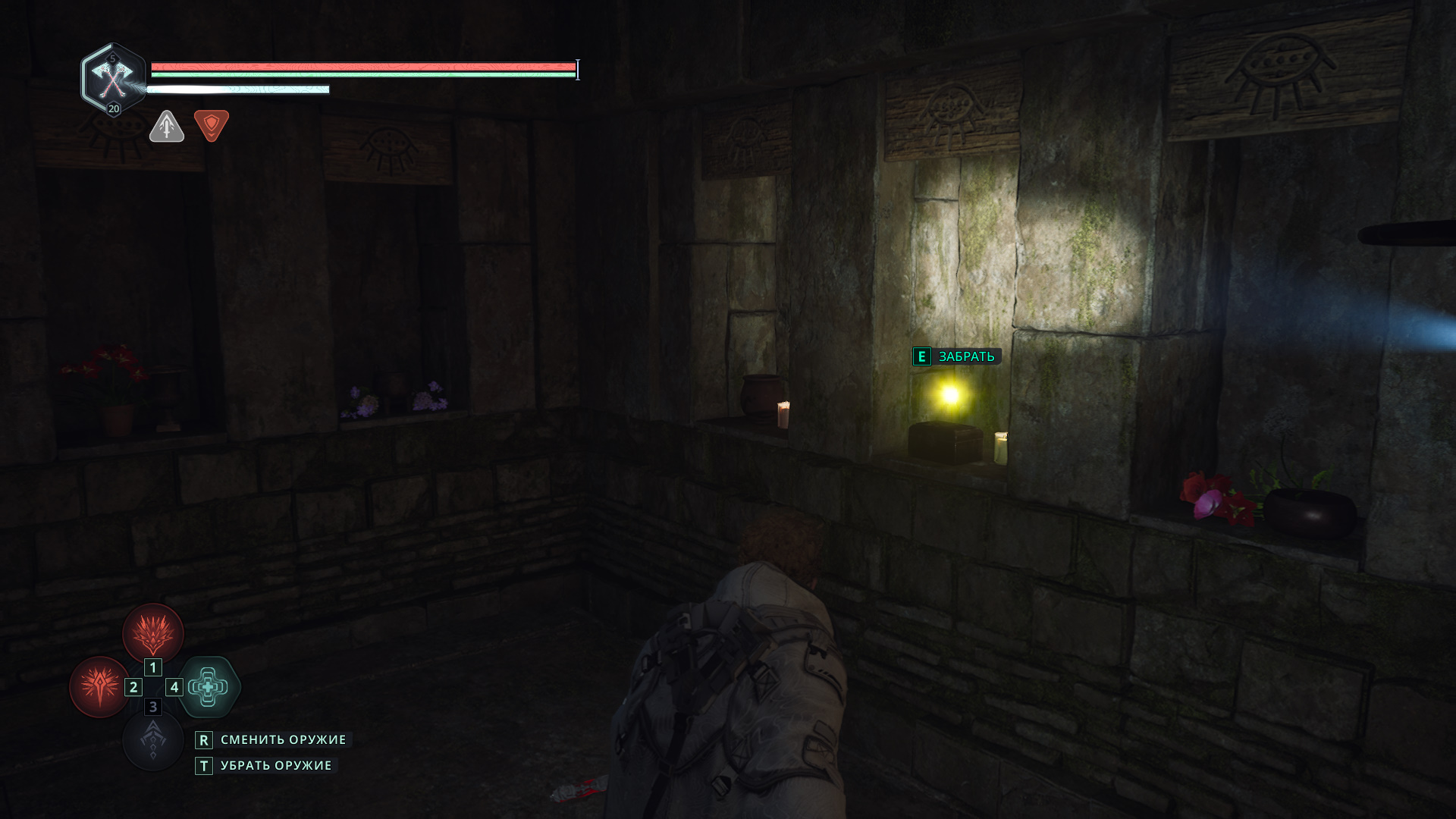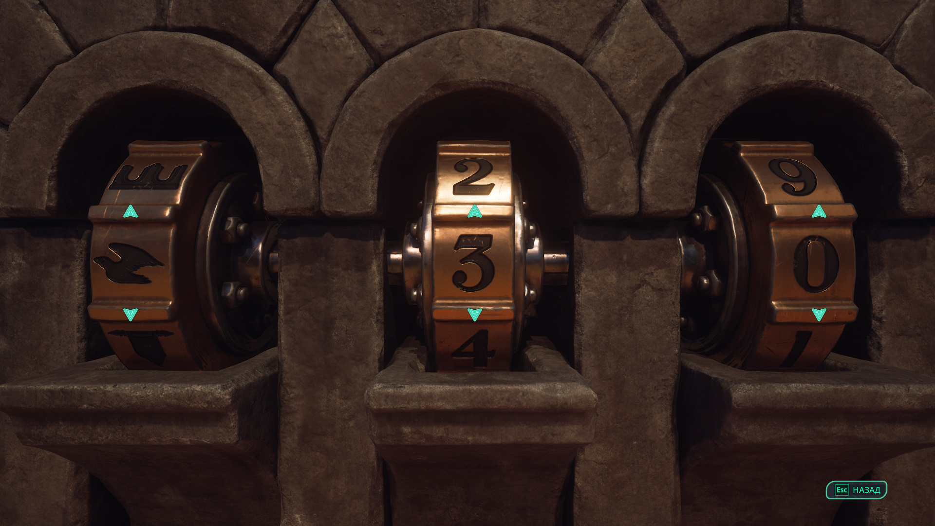 На алтаре лежит записка «Подрядчик». Выйдите через другую дверь и убейте второго Стража временной петли. Вы обнаружите беседку, слева и справа есть 12 дисков с символами и цифрами. Пока что код вам неизвестен.