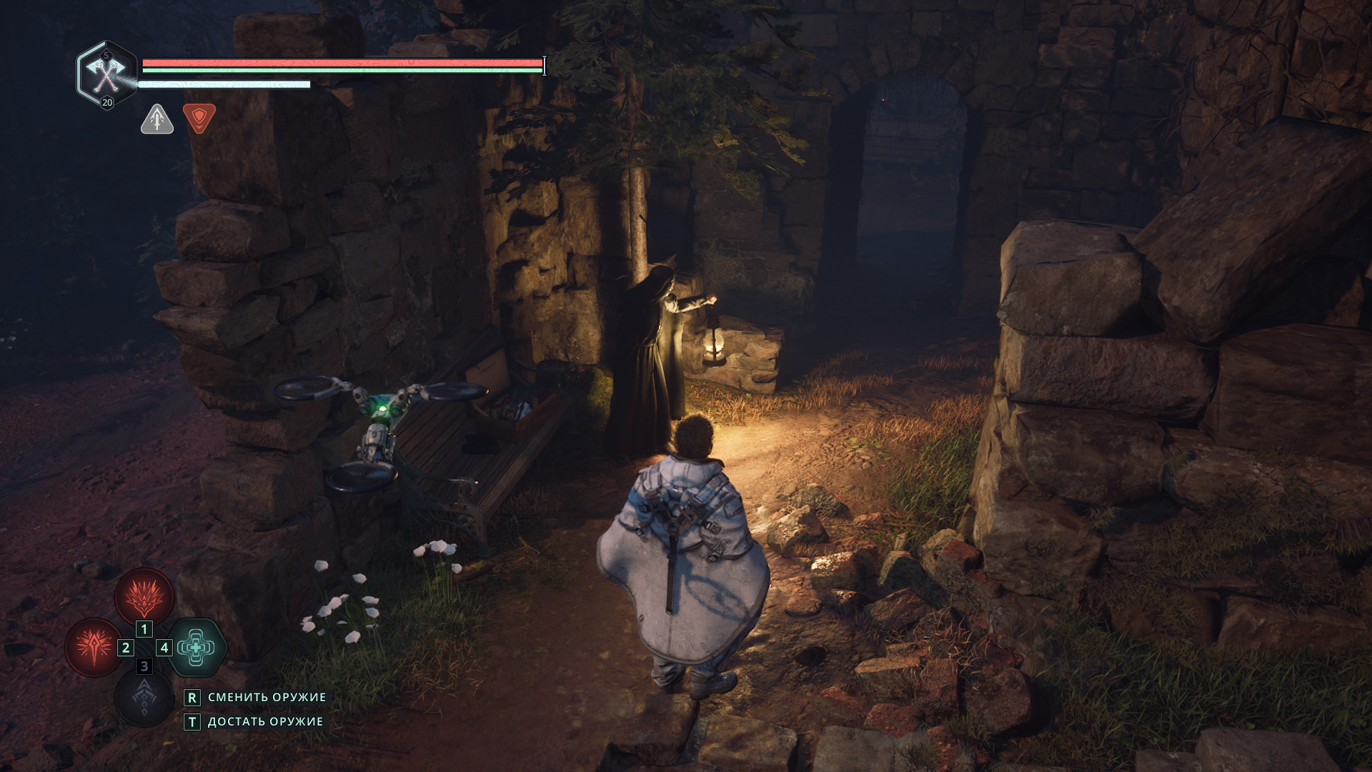 Спуститесь по лестнице слева от монаха и найдите на скамье карманные часы (предмет для исследования).