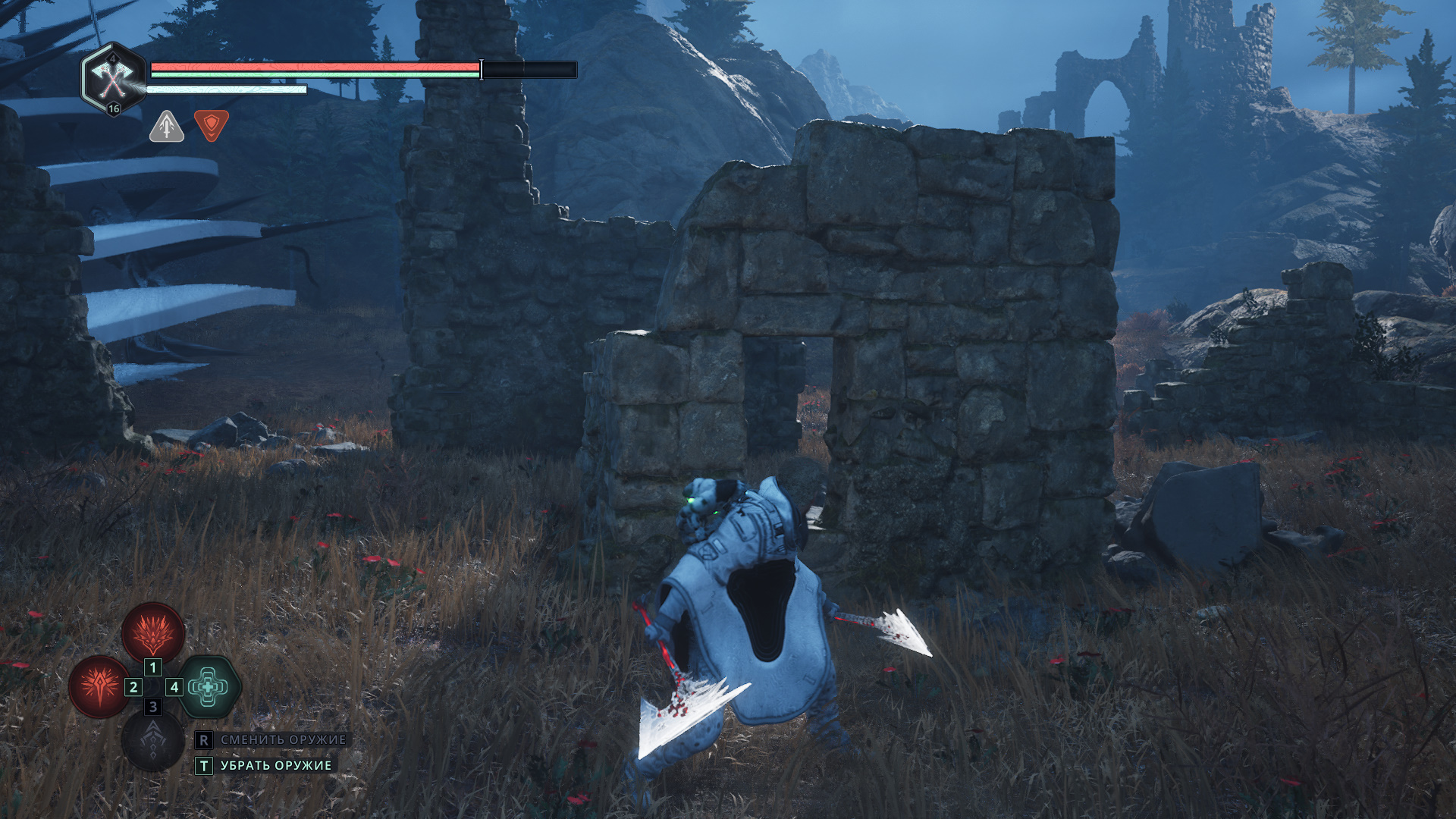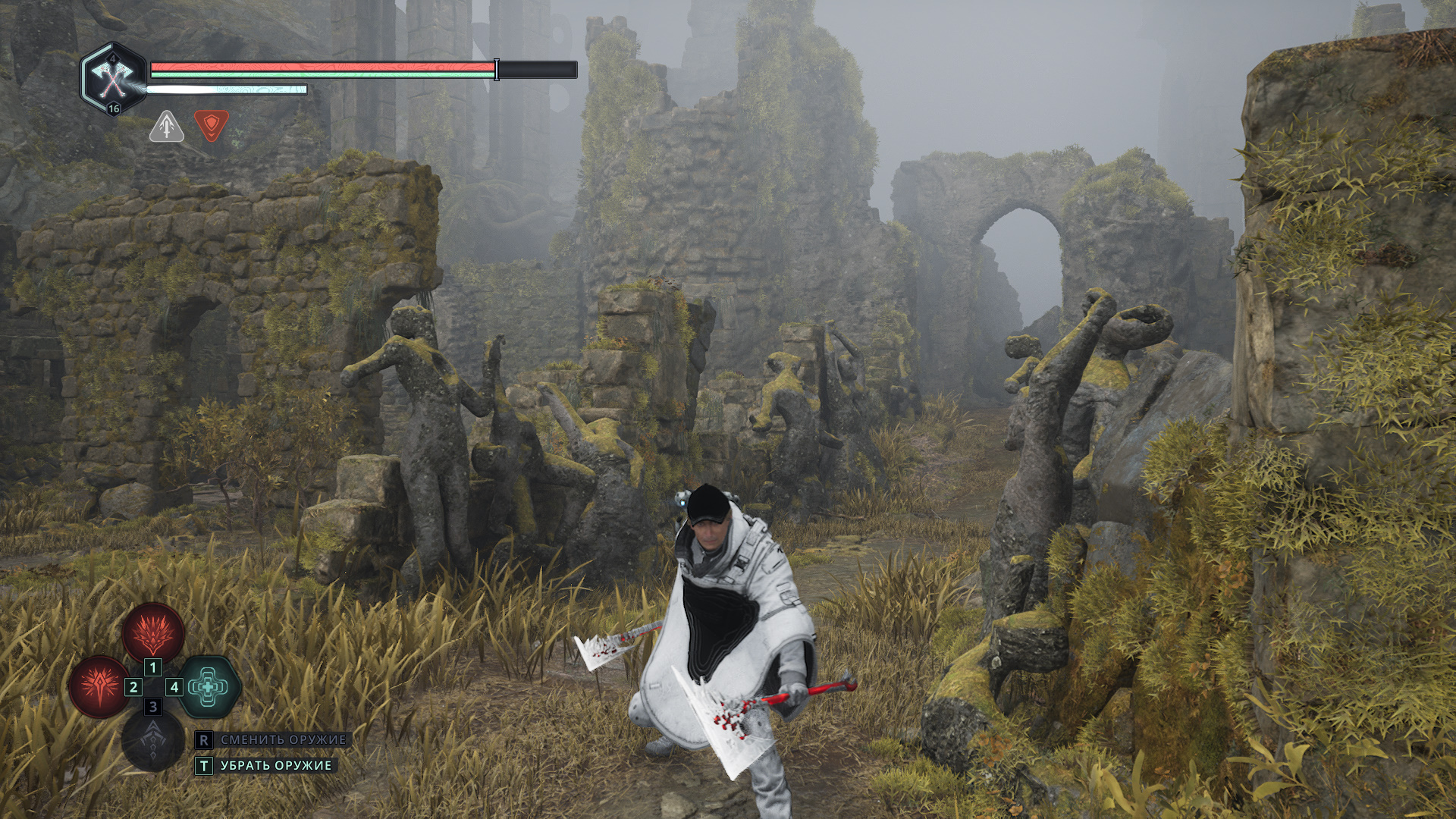 Перейдите по доскам на другую сторону и сначала идите влево. Убейте врагов (в том числе моба, который стрелял по вам издали). Будет один Страж временной петли. В руинах за стражем валяется замшелый ключ. Так вы активируете тайну «В зарослях». С другой стороны лежит дневник леди Софии «Остаток пути». Когда обнаружите главный вход, куда примените двуглавого змея, посмотрите правее. Идите по тропе и в руинах слева обнаружите сундук, который открывается этим ключом. Вы получите защитное снаряжение «Идол счастья (боевой транс)» — при сильном ранении повышает наносимый урон с каждым вашим ударом. Тайна раскрыта.