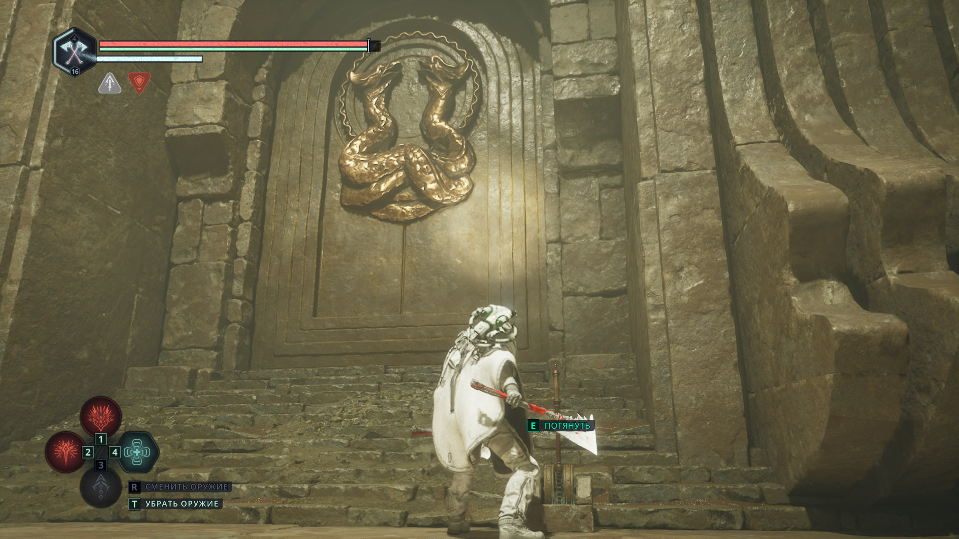 Спуститесь в Храм Павших, увидите временную петлю. Убейте слева ее стража и идите в единственный доступный проход. Потяните за рычаг, чтобы поднять стену со змеями. Потяните за другой рычаг, и вскоре, пройдя мимо камней с воткнутыми кинжалами, обнаружите точку сохранения и развилку.