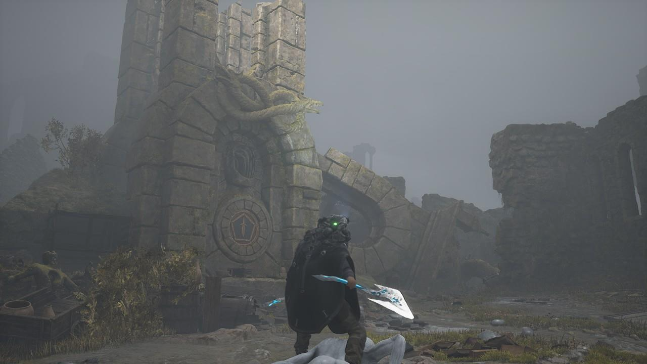 Продолжите движение в другую сторону и найдите главный вход с выемкой под двуглавого змея. Вставьте предмет, чтобы обнаружить кодовую панель. Нужно найти четыре символа. В руинах справа также валяется дневник леди Софии «Прибытие». Спрыгните через дыру в полу, убейте монстра, подберите добычу и выберитесь по лестнице. Вы увидите символ «солнца». До этого можно было найти символы меча» и «бутона». Также справа от входа есть руины с сундуком, который открывается ранее найденным замшелым ключом.