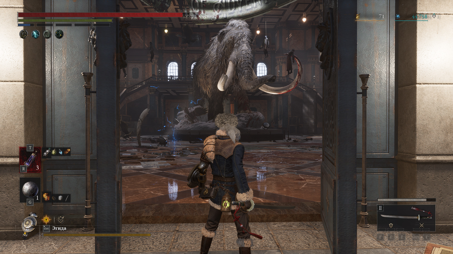 Вы можете пойти в правое или левое крыло. Для начала давайте сходим вправо. Зачистите зал с витринами, пройдите вперед и спуститесь в большое помещение со слоном. Убейте его. Получите сверкающий кристалл эрго (+10 000).