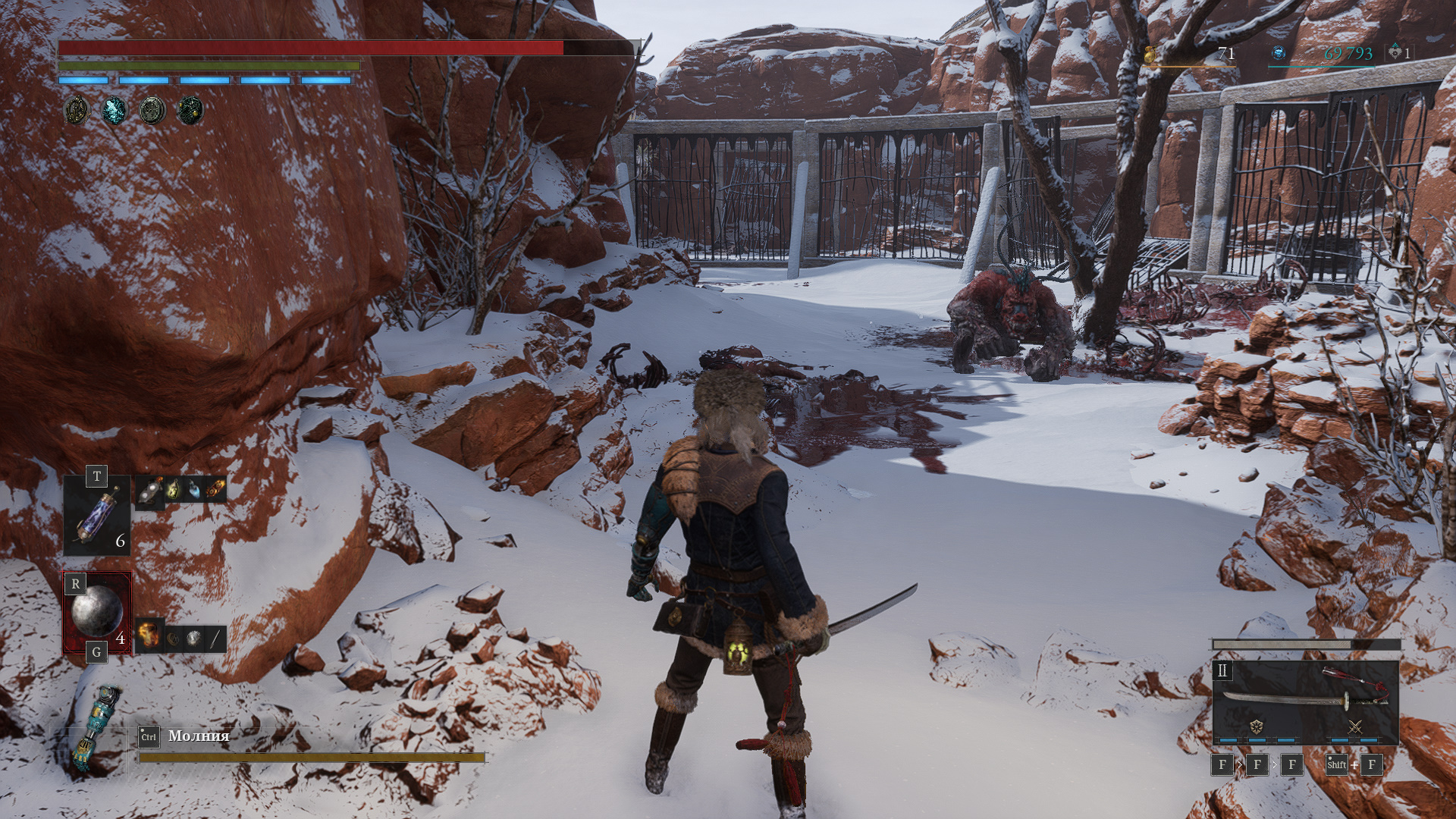 Также вы узнаете за эффект заморозки, который срабатывает при накоплении холода: вы постепенно теряете здоровье, ваши действия замедляются, сила атаки уменьшается. В середине области с первыми врагами лежит ампула защиты от замерзания.