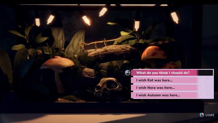 Подойдите к террариуму на комоде. На этот раз, когда выберите фразу «Привет…» Прутик при взаимодействии с Жуком-Палочником, появятся новые варианты диалога. Выбранная реплика повлияет на ваши отношения с одной из девушек: