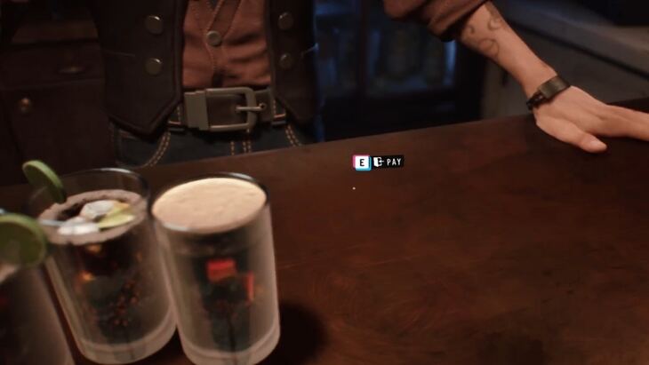 Затем Гас озвучит цену за напитки. Посмотрите чуть правее и нажмите на клавишу E, чтобы заплатить и забрать напитки.
