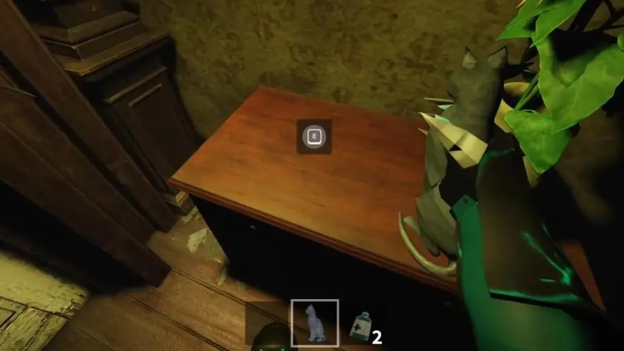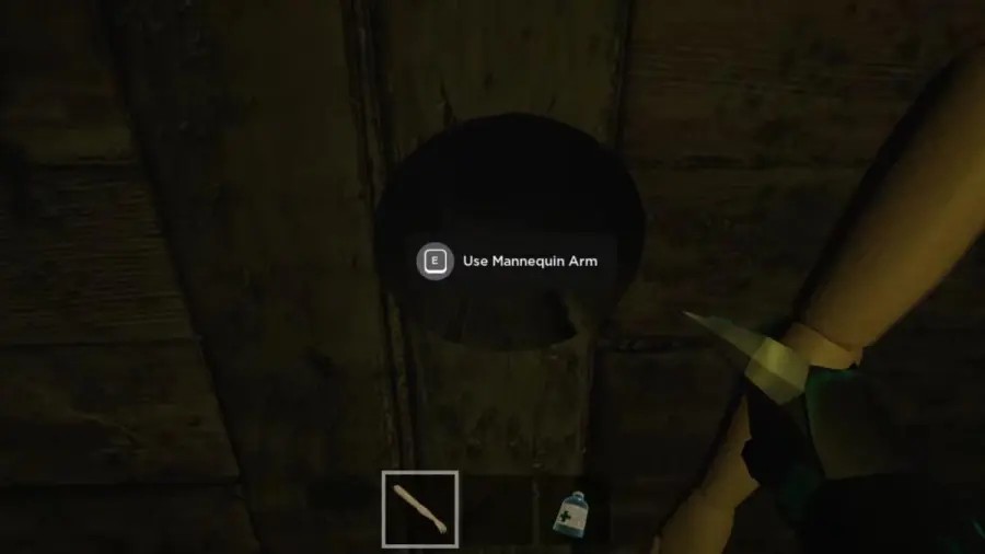 Как только получите предмет, нажмите на клавишу Q, чтобы открыть инвентарь, и экипируйте руку манекена в активный слот. Затем подойдите к отверстию в стене, на которое указывает большая стрелка, и установите туда руку манекена — так вы откроете проход. Не забудьте подобрать аптечку и другие полезные припасы, прежде чем покинуть чердак.