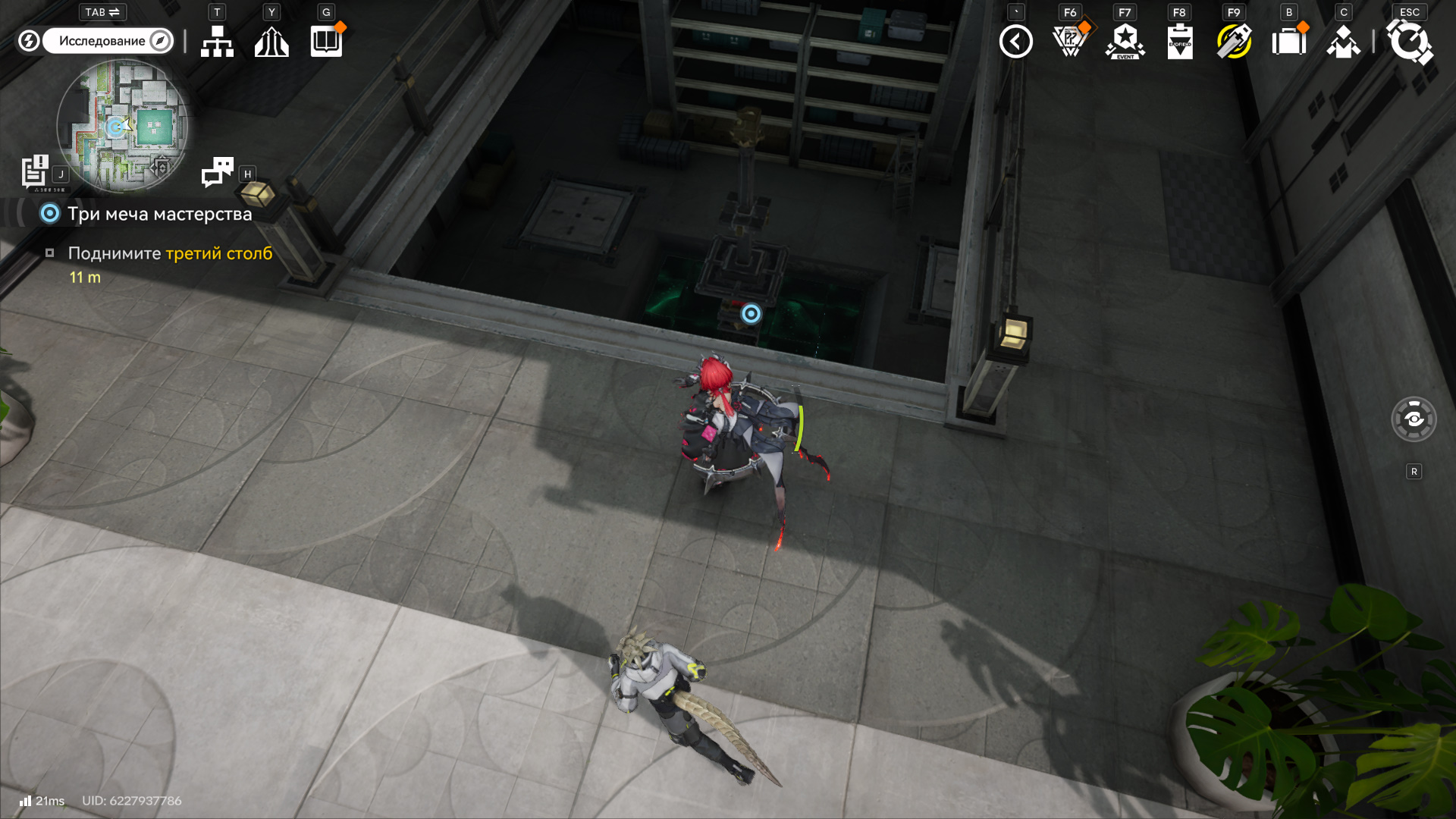 Взаимодействуйте с первым оружейным столбом. Запомните последовательность, в которой активируются пластины. Затем в прыжке ударом с воздуха активируйте их в той же последовательности. Если смотреть на спину Оловяна, то активировать нужно справа налево. Поговорите с Оловяном.