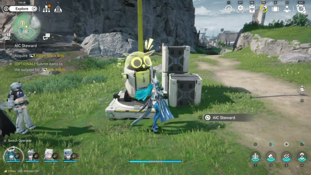 Телепортируйтесь в Ключевую область АПК в Долине IV. Направляйтесь в юго-восточный угол вашей текущей сетки АПК, которая выделена желтым барьером. Взаимодействуйте с новым объектом, который там появился — выглядит как робот с большой совиной головой.