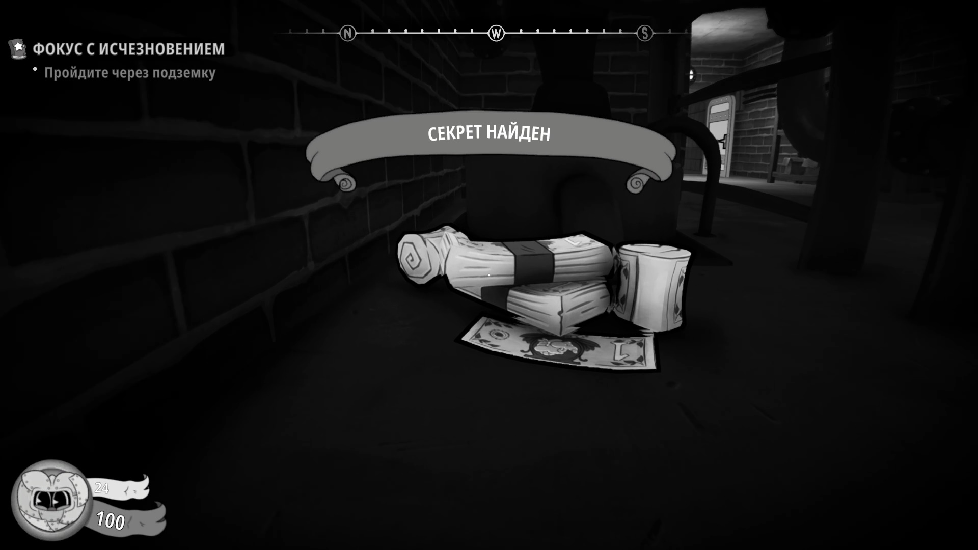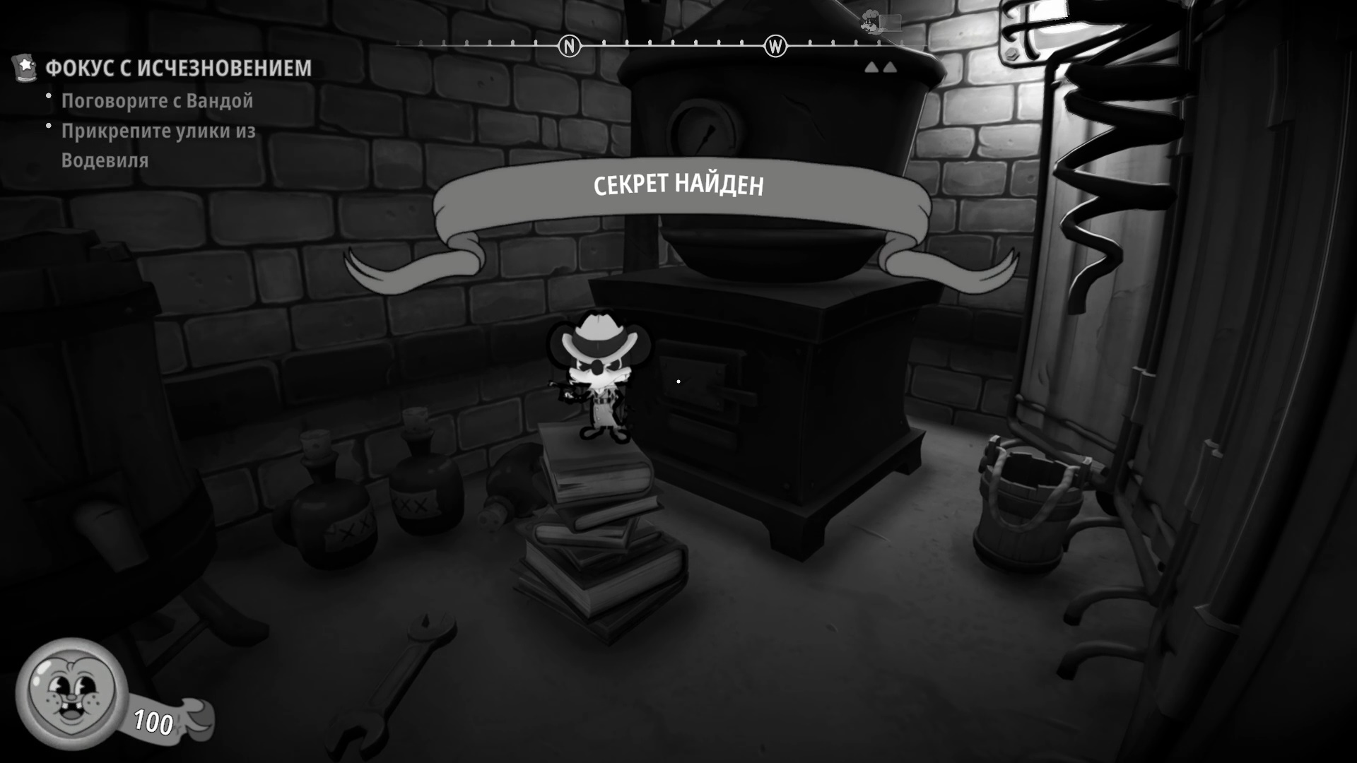 Секрет №1. Когда выпрыгните из вагона с печатной машинкой, пройдите за ширму слева, чтобы найти деньги и сыр.