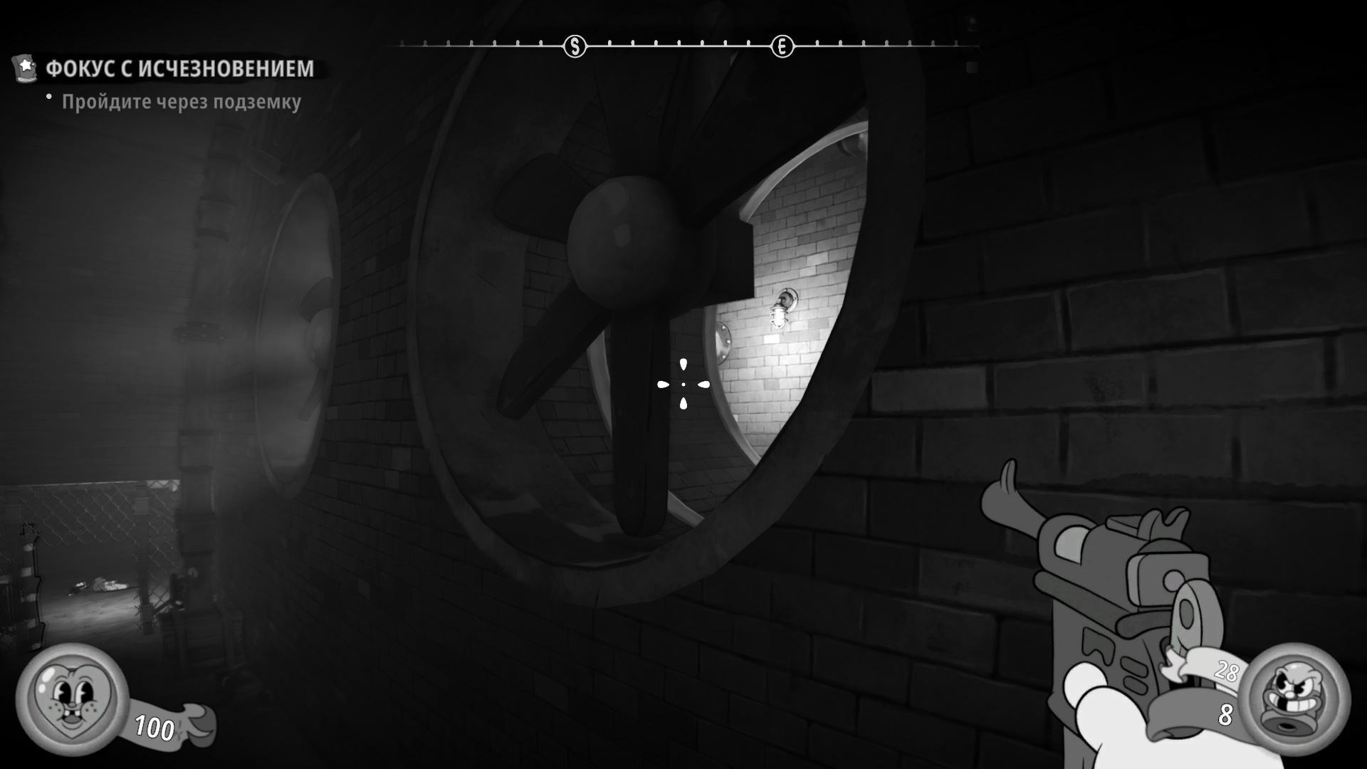 Выйдите из кабака и убейте врагов. Опустите рычаг справа от ямы и перепрыгните на другую сторону. Откройте решетку слева, чтобы создать короткий путь. Поднимитесь по ступеням рядом, пройдите по мостику к мигающей лампе и печатной машинке. Опустите рубильник слева.