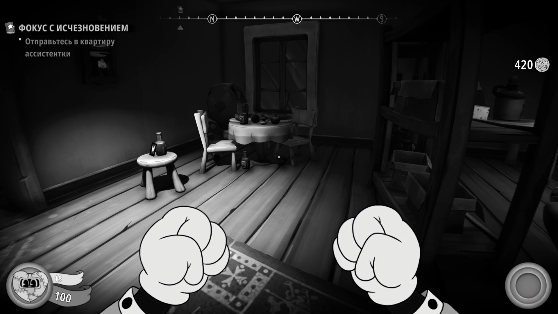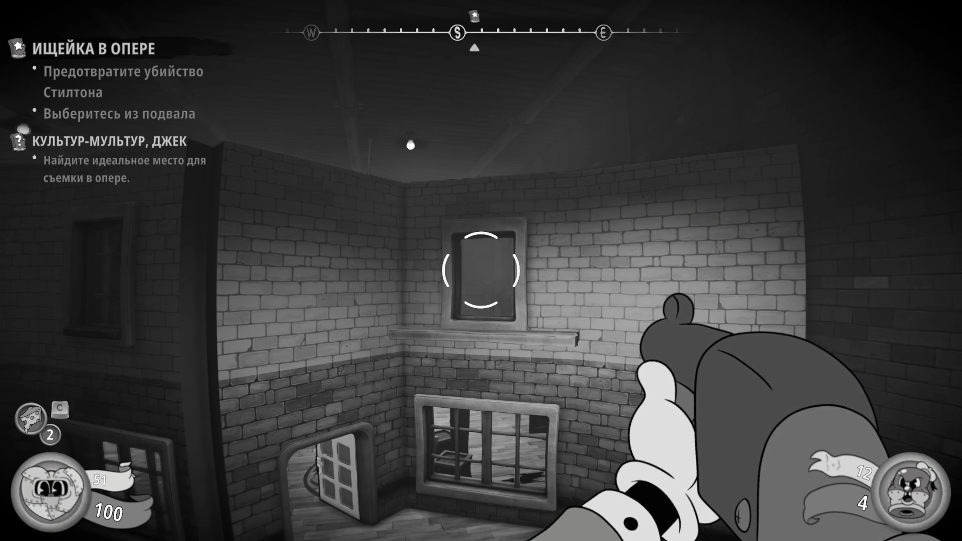 Подойдите к двери с круглыми окнами справа, чтобы сфотографировать представителей партии Больших Мышей. В конце побеседуйте с официантом. Можно заплатить 30 монет, но лучше сэкономить. Ищите слева от него вентиляцию и перемещайтесь через нее. Когда свалитесь на улицу, вернитесь и проползите через ту же вентиляцию, используя фонарь. Просто обойдите дыру.