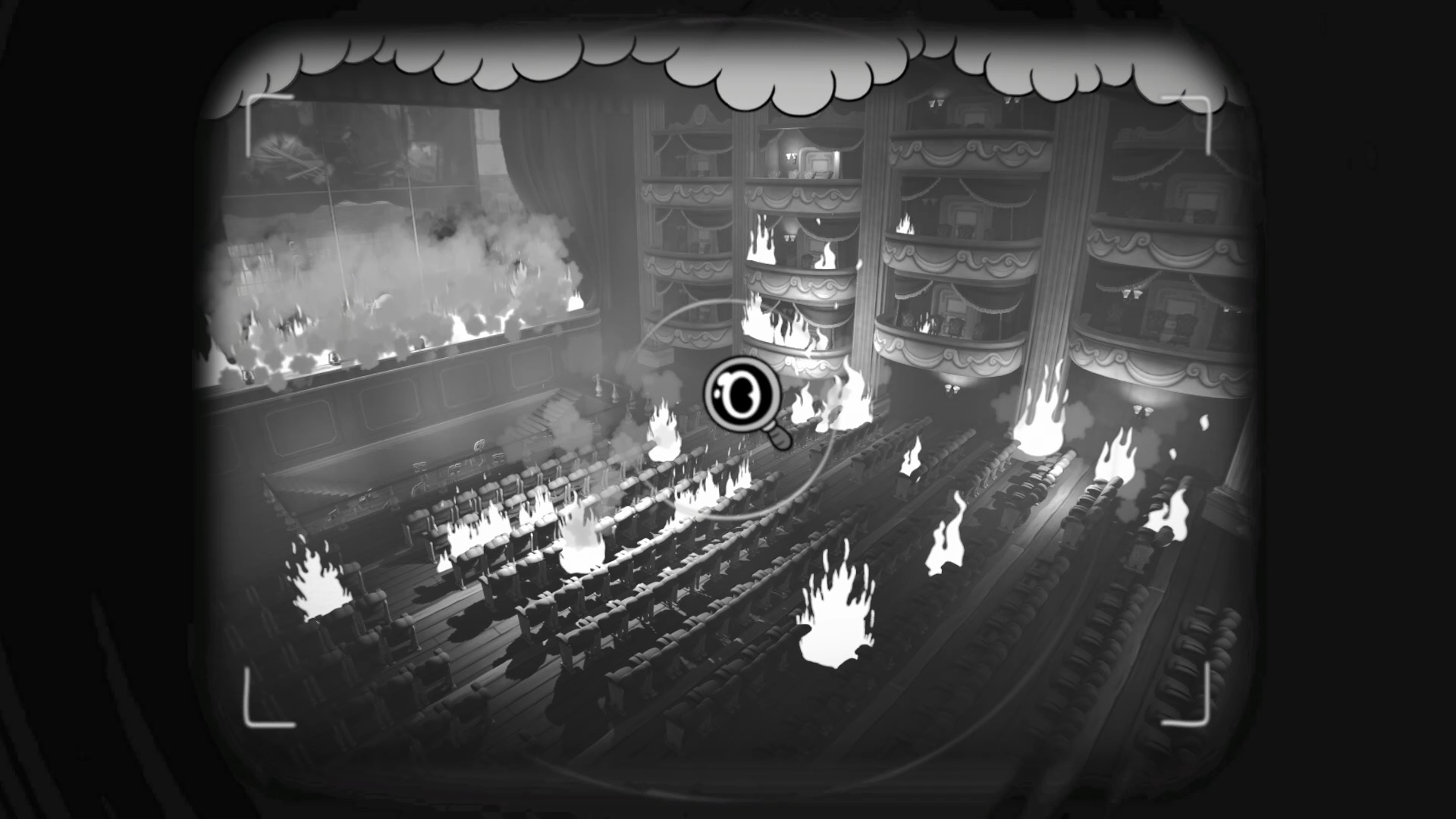 После победы двигайтесь к выходу. Поднявшись по ступенькам, вы окажетесь на балконах горящего зала. Нужно двигаться по доскам. Находясь на доске, изучите зал и сделайте фотографию, что нужно по дополнительному заданию от Тэмми ««Культур-Мультур, Джек».