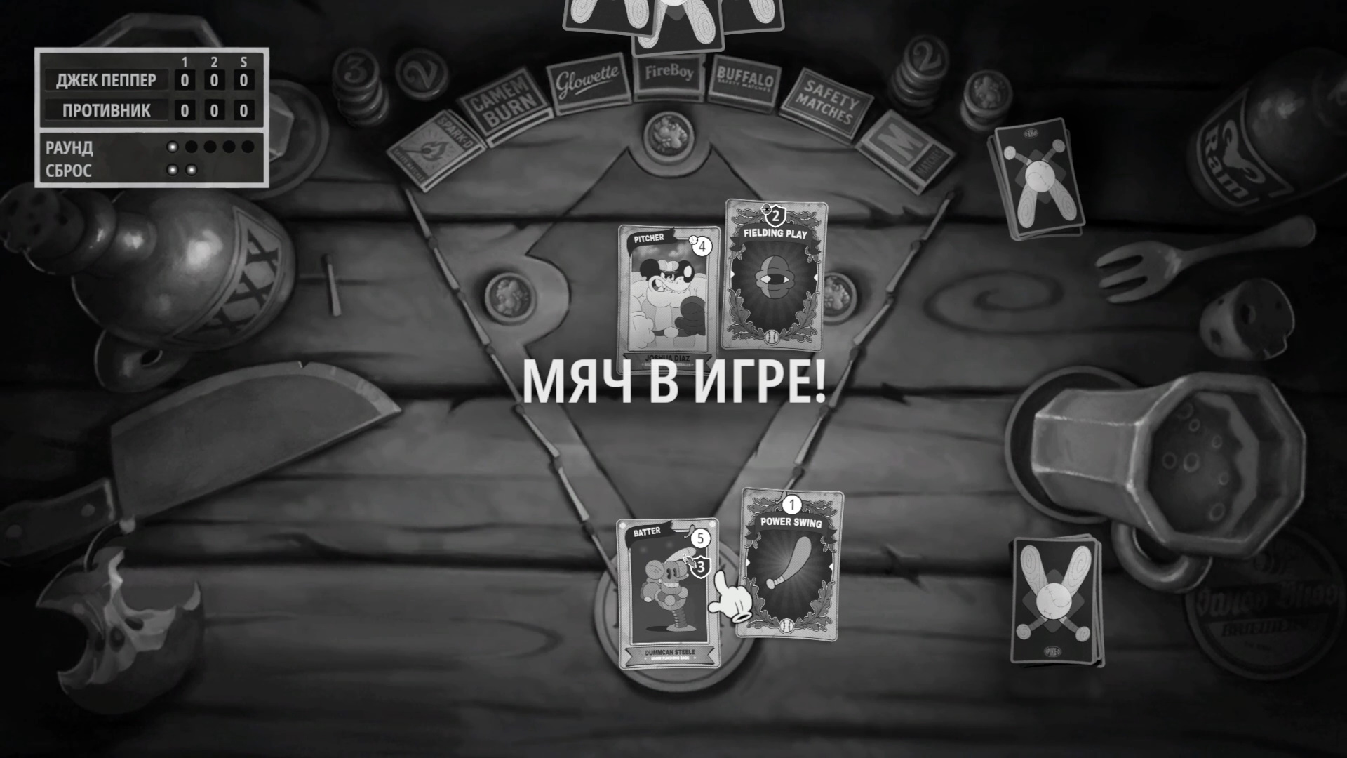 Еще один момент: если значение силы подающего более чем на 3 единиц меньше, чем у отбивающего, отбивающий игрок сделает хоумран и пробежит к базе за этот же ход (как и все остальные игроки в поле). Также у вас есть 2 сброса за иннинг: можно скинуть карту и сразу же взять другую.