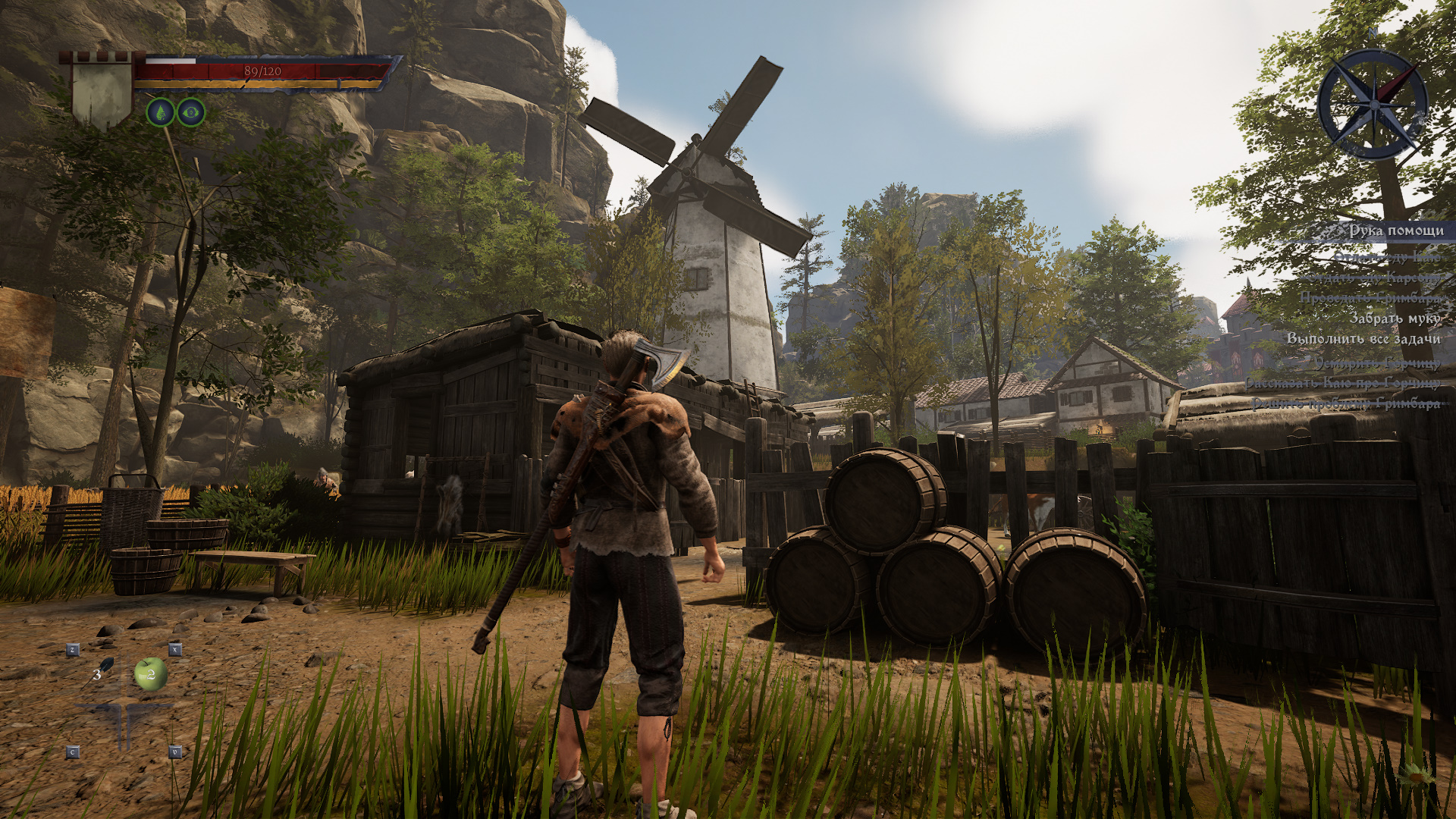 Наконец, рядом с домом есть мельница (нет, идти на мельницу у Заброшенной деревни, к счастью, не придется). Пройдите к ней, обыщите мешок у входа и заберите 1 мешков муки.