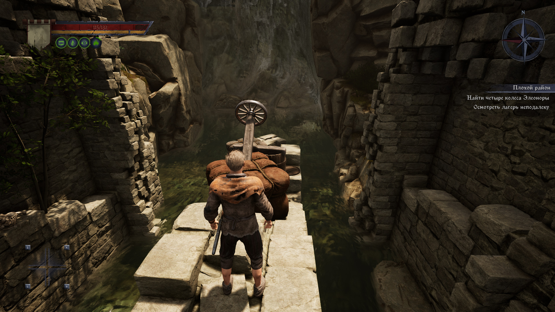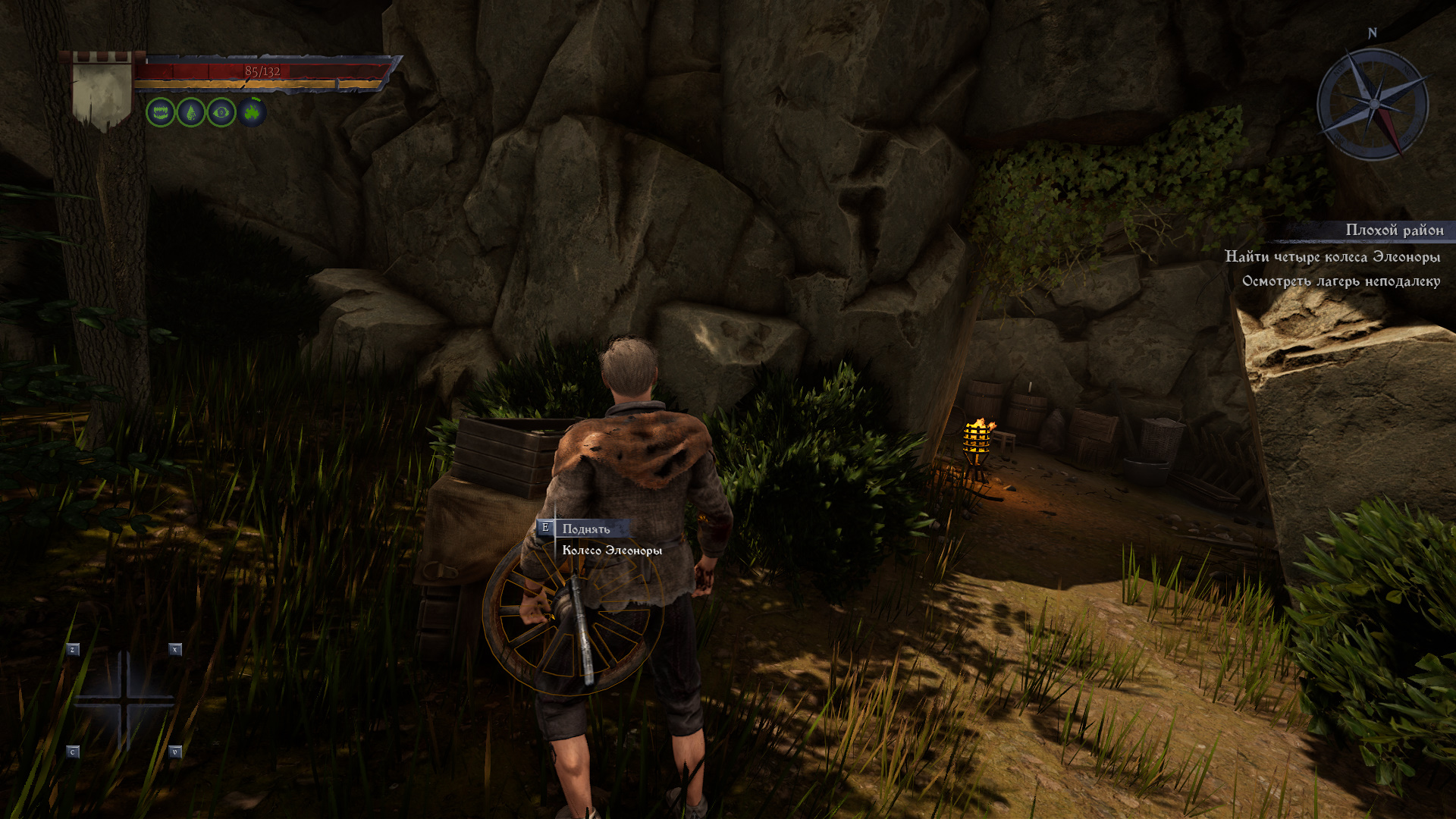 Перейдите по деревянному мосту за заброшенной деревней, чтобы встретить торговца, потерявшего колеса от своей телеги Элеоноры. Это начнет побочное задание «Плохой район». Описано выше.