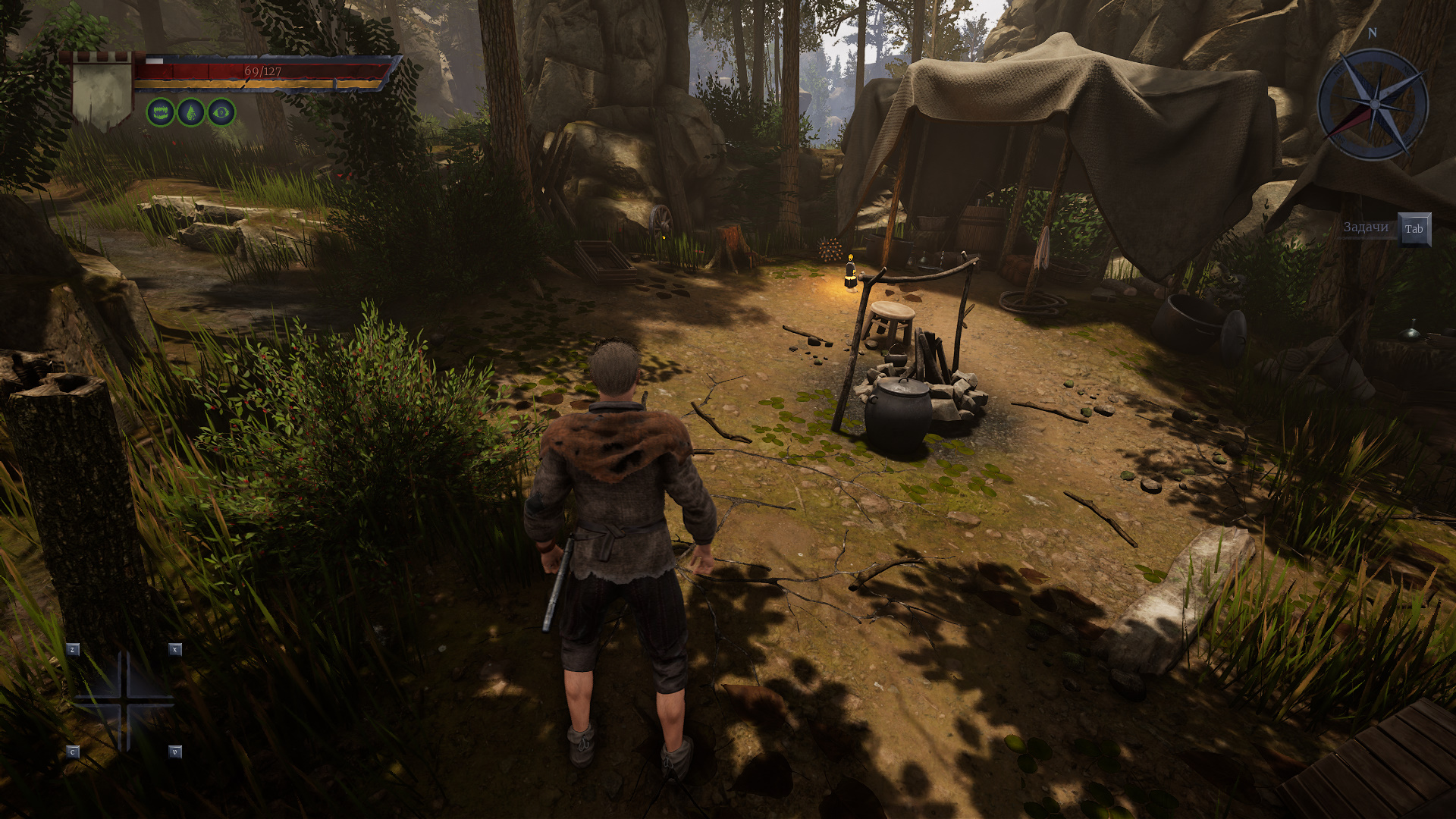 Осмотрите лесозаготовку около лагеря. Одно из мест будет отмечено золотыми искрами (как лут). Затем войдите в лагерь и идите к навесу, под которым находится сено, где можно поспать. Там будет еще одно отмеченное место.