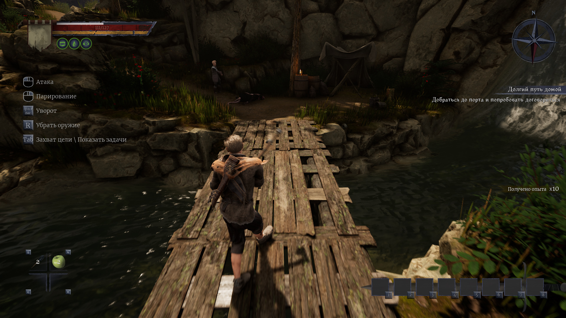 Начать лучше всего с этого задания. Пройдите к разрушенному мосту напротив лагеря лесорубов, на его край, чтобы Тристан заметил, что никто его не ремонтирует. Вернитесь к Акиму, который попросит сыскать Еремея из пригорода Грейшафта.