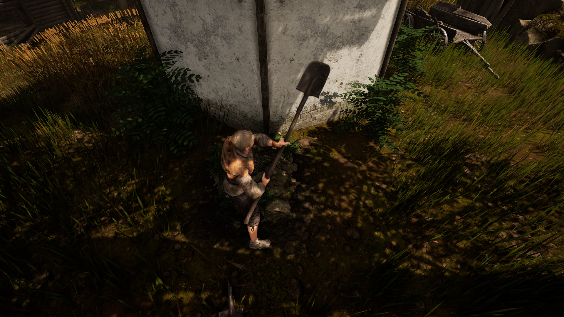 Поднимитесь к мельнице, обойдите и увидите черный грунт. Чтобы копать, встаньте прямо перед грунтом и нажмите на клавишу, соответствующую слоту лопаты. Лопату нужно поместить в слот через инвентарь, щелкнув ЛКМ. Внутри этого сундука есть 2 отмычки и 50 золота.