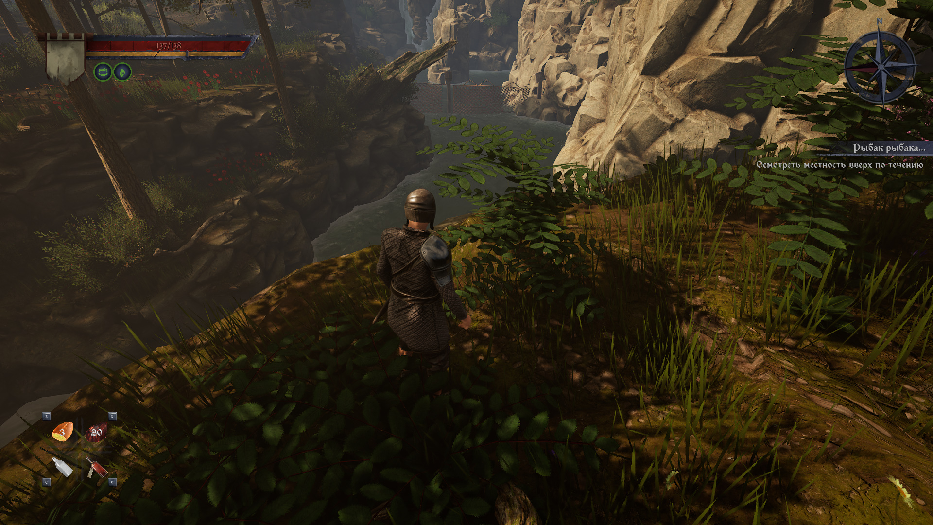 Двигайтесь влево от рыбака, вдоль реки. Сверните вправо. Здесь сидят браконьер и Борх. Пройдите мимо них. Река уходит вправо, а вы двигайтесь вдоль холма и перейдите по деревянному мосту. Заберитесь на возвышенность справа (идти сбоку не рекомендуется, поскольку там стоит скиталец).