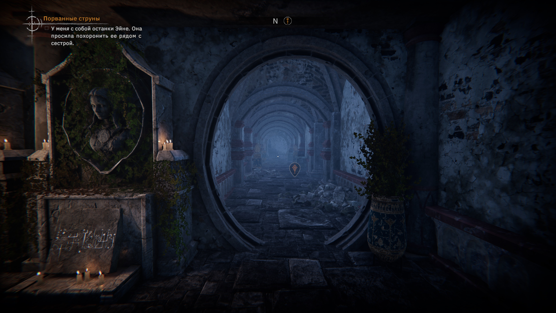 Покиньте гробницу, разожгите костер и отдохните до ночи. Ночью вернитесь в гробницу арфисток, и сможете пойти по правому коридору. Поговорите с Эйдин, победите духов Гнев и Алчность, вновь пообщайтесь и получите ее прах.