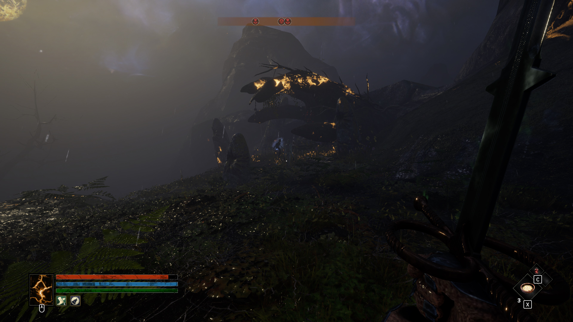 Неподалеку от предыдущего квестодателя есть дерево с красным флажками, на котором висит труп. Вы можете заговорить с мертвецом, чтобы начать задание. Сначала двигайтесь по маркеру днем и убейте двух пикси. После отдохните у костра до ночи, чтобы появился зловещий дух друида.