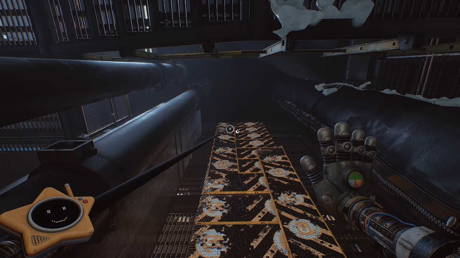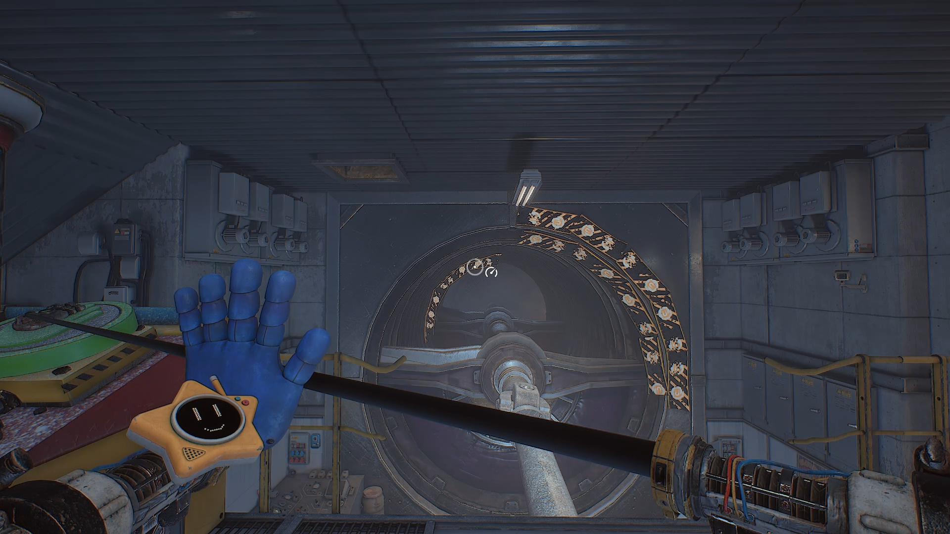 Передвиньте подвесной блок с поручнями под потолком — он нужен, чтобы запрыгнуть к двум панелям управления элементами вращающегося механизма. Прежде чем использовать их, осмотрите угол комнаты: там находится вентиль на синей трубе. Поверните его и сразу направляйтесь к синей двери внизу. Под ней появится замороженная жижа. Разбейте лед рукой-давилкой.