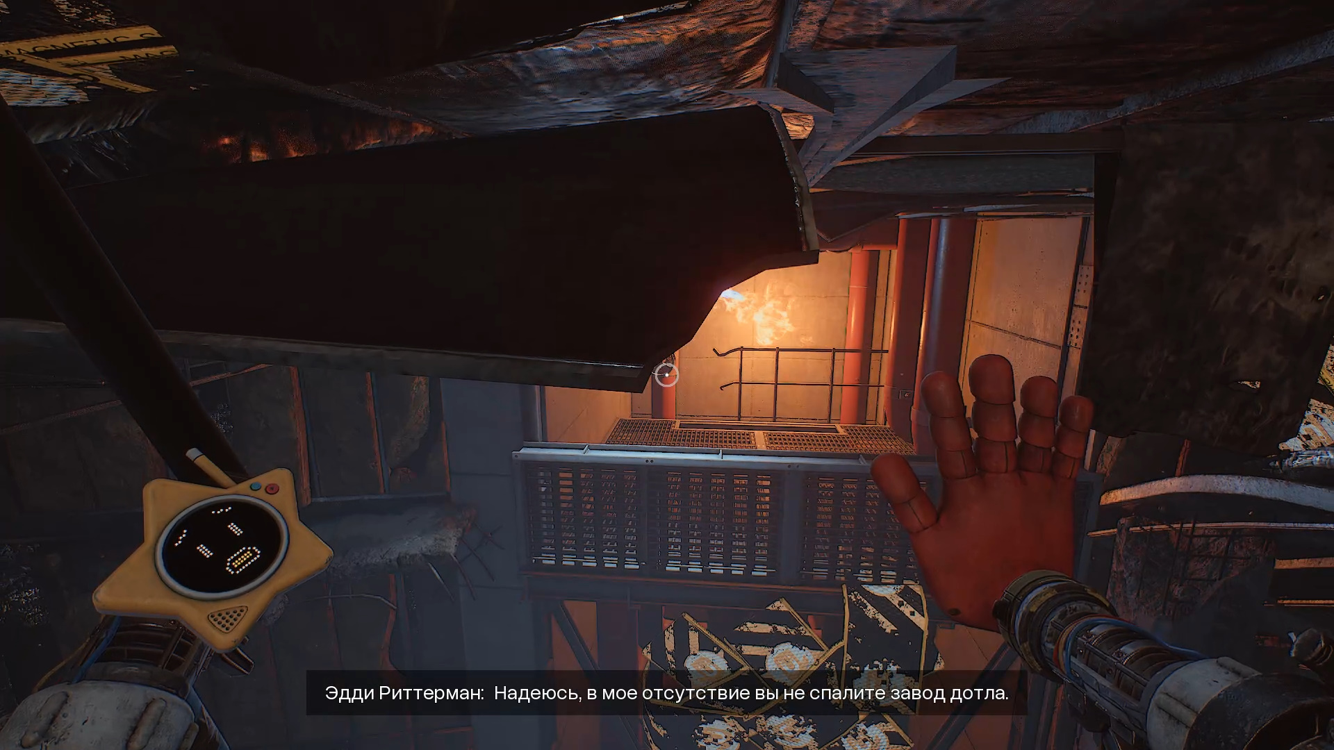 Начнётся участок с активным использованием магнитных панелей. Перемещайтесь над ямой с помощью магнитной руки. Развернитесь назад — в коридоре справа будут дополнительные панели. Поднимитесь выше, притянитесь к панелям над головой и перекройте вентиль на красной трубе с огнём.