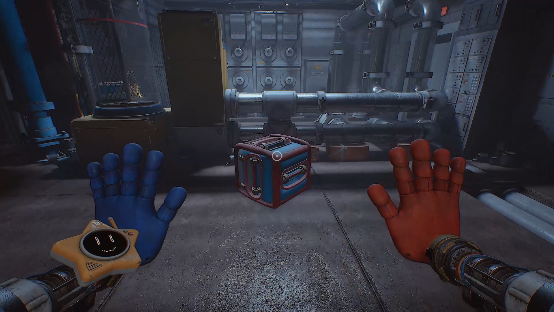 Развернитесь, притяните блок с поручнями, затем подтяните жёлтый ящик. При необходимости переключайтесь на красную руку. С помощью поручня сверху заберитесь на ящик и по поддонам переберитесь к зоне с красными коробками.
