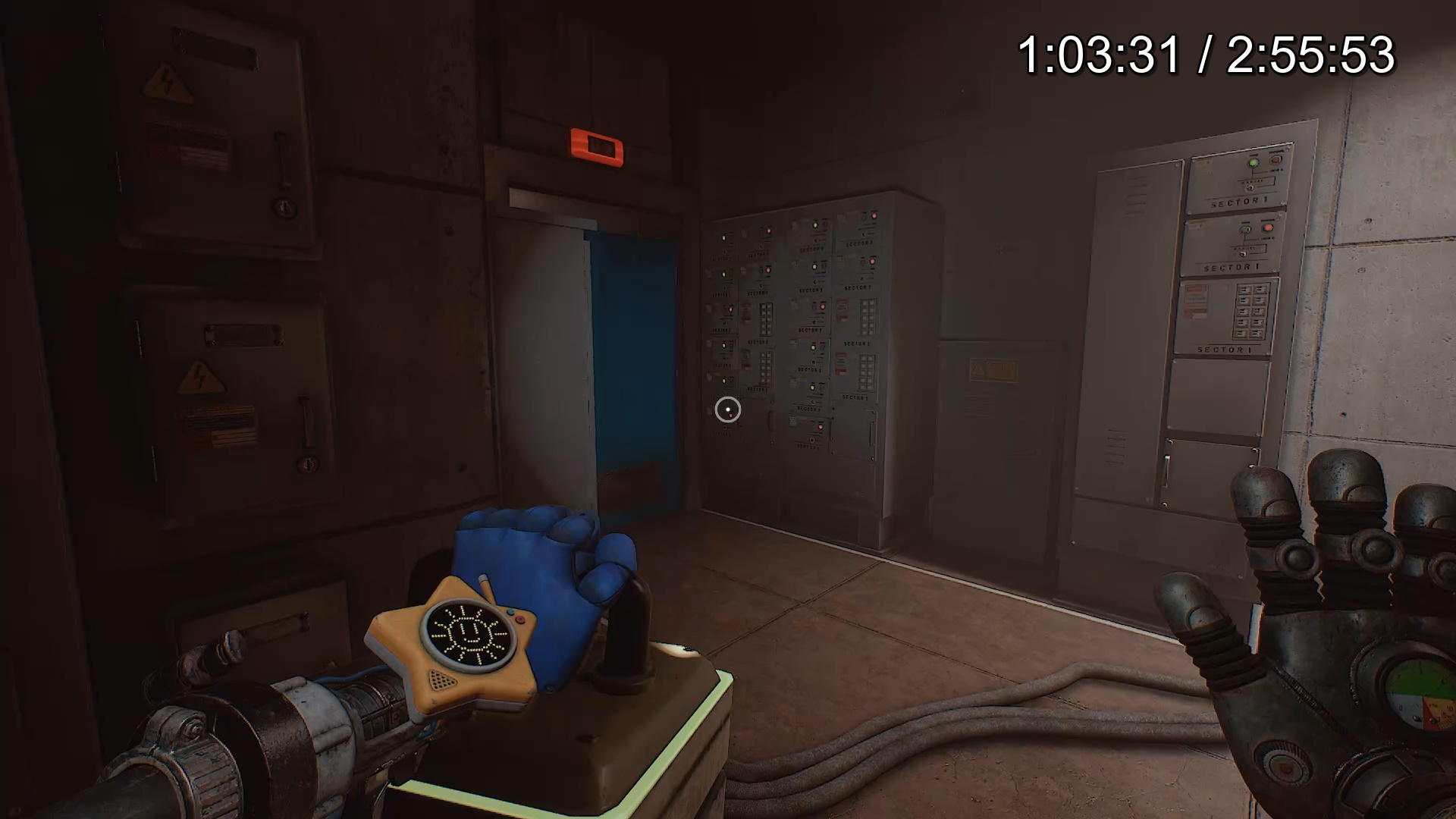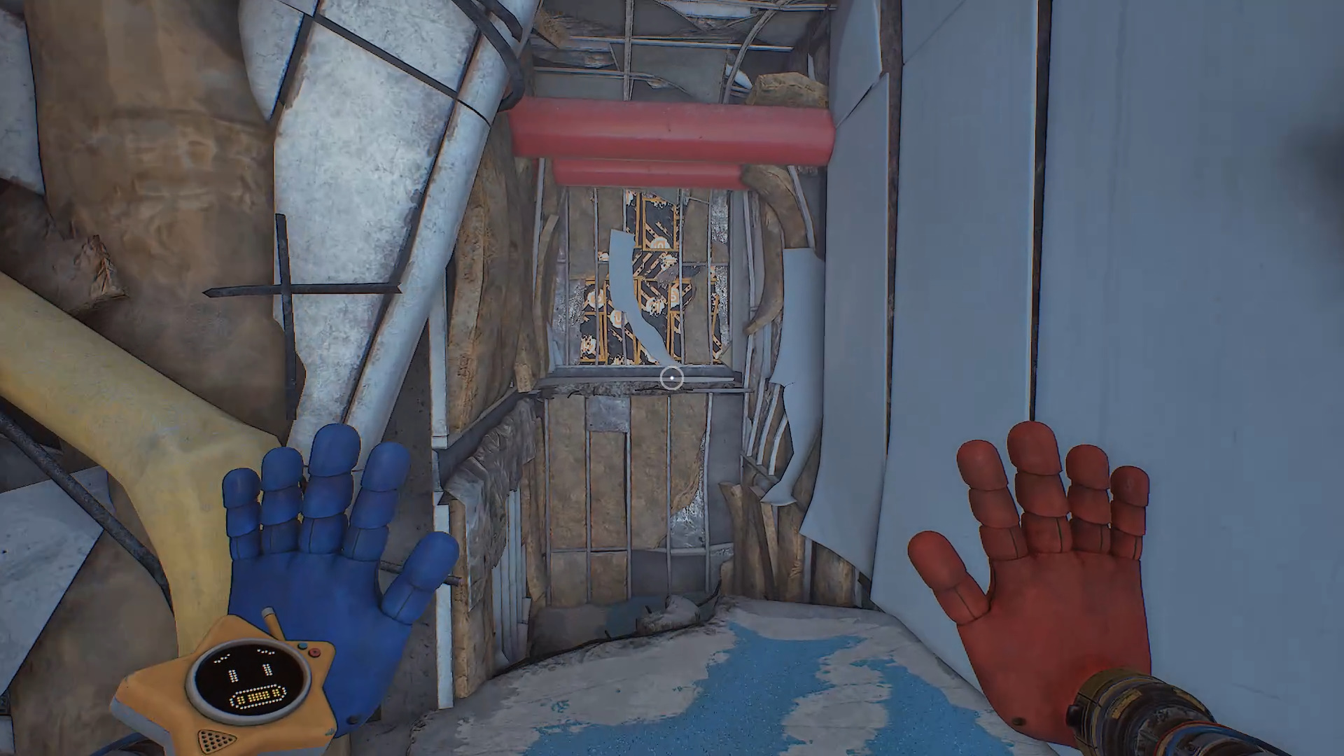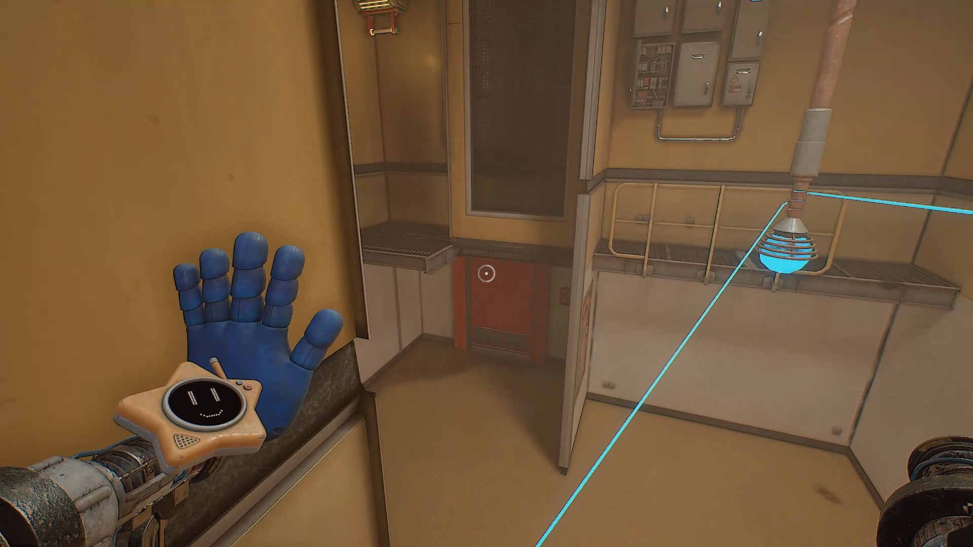 Когда появится возможность, используйте подвешенный блок и его поручни, чтобы запрыгнуть на выступ справа от кнопки. Красную дверь откройте через синюю панель, приложив руку. Пройдите через комнату обеззараживания.