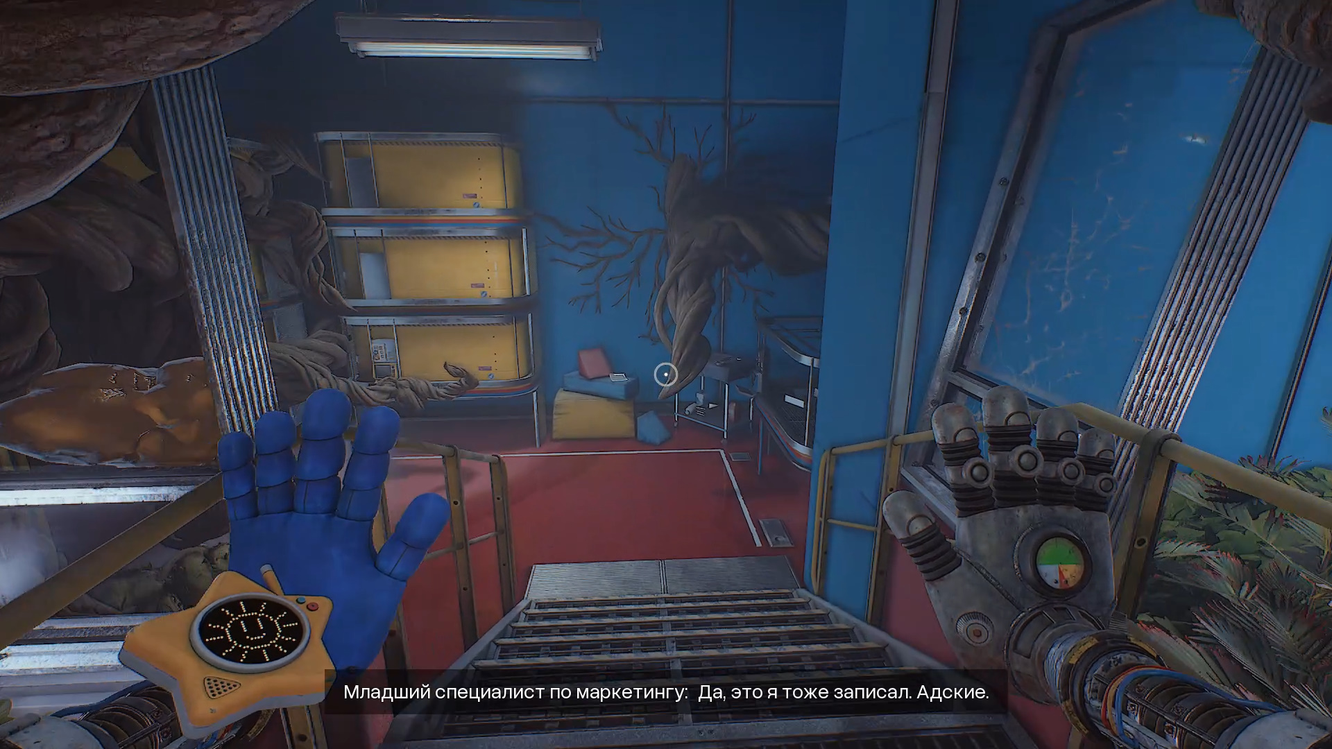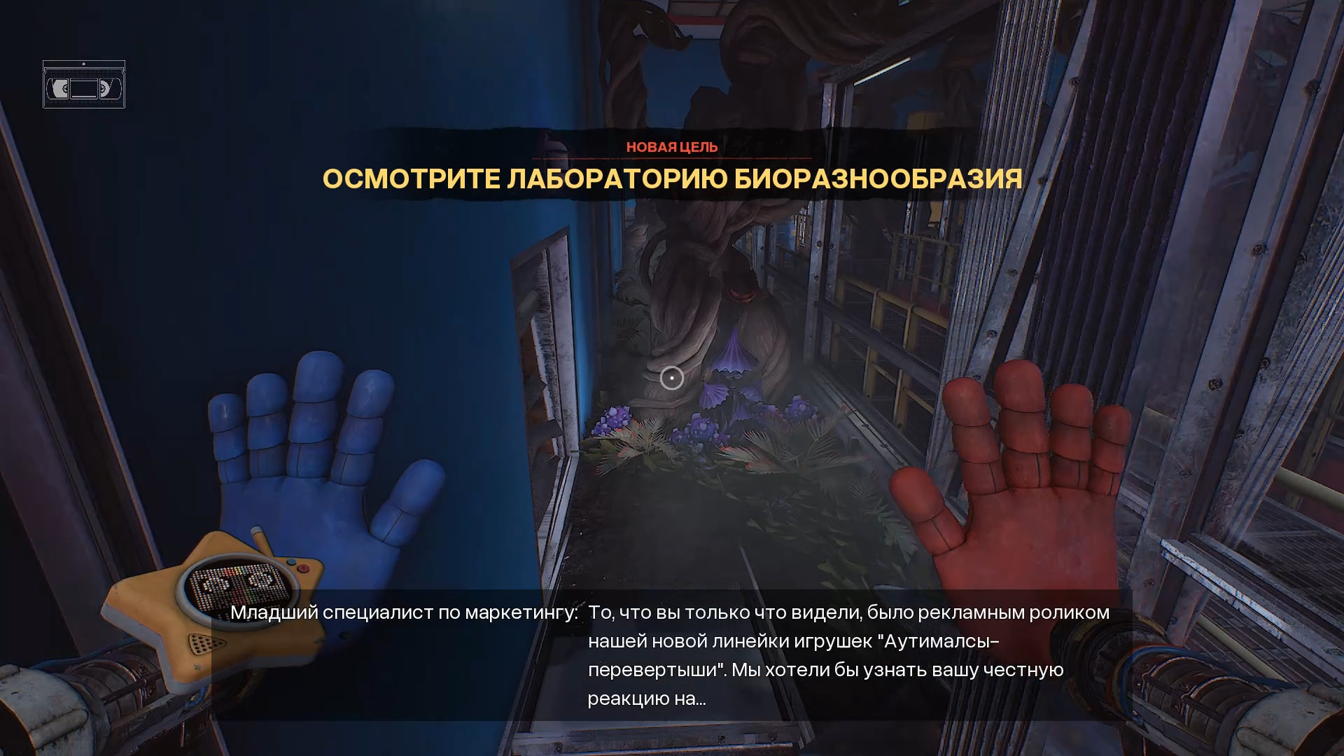 Вернитесь в основной зал лаборатории. Путь вам преграждает разросшееся растение — примените руку-давилку к оранжевому наросту, чтобы расчистить проход. Сломайте ветку и оттолкните ящик на противоположной стороне тем же инструментом. Справа на ящике лежит записка.