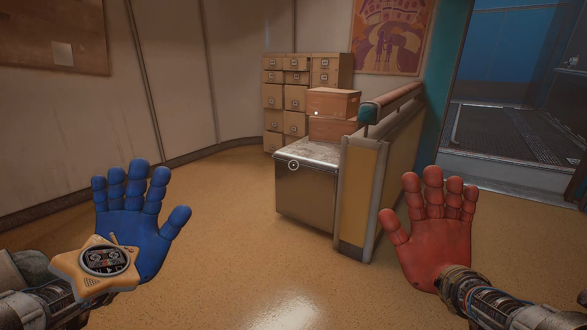 Кроме того, найдите другую шахту лифта и спрыгните вниз. Пригнитесь и притяните батарейку. Следуйте дальше двери, по которой двигали засовы, и обнаружите синюю дверь справа. Войдите, вставьте батарейку и заберите из комнаты записку.
