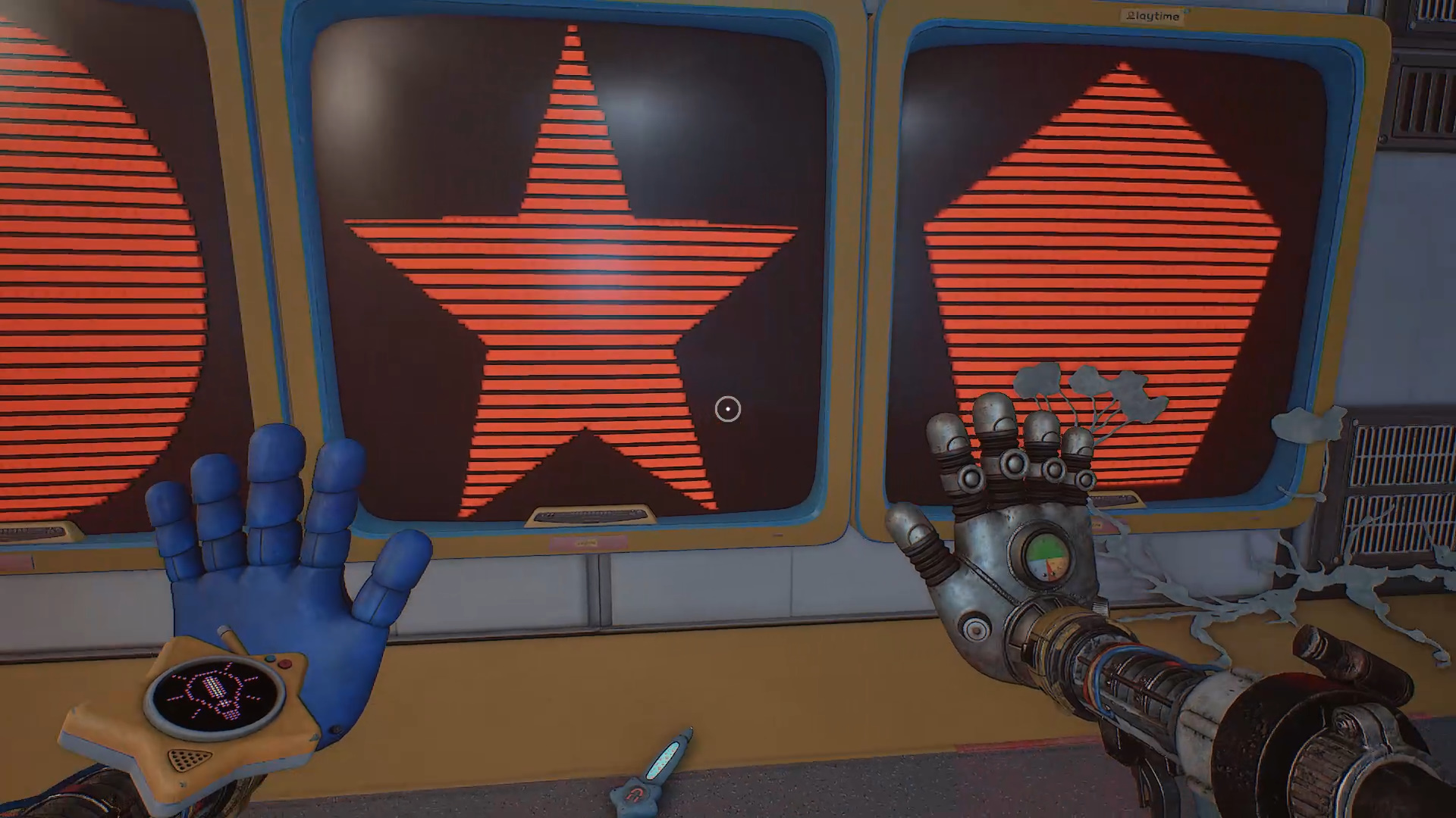 Вернитесь в основной зал. На панели заметны три крупных красных символа — их комбинация всегда случайная. Запомните порядок фигур. Под вращающимся механизмом расположены несколько рычагов. Включите ультрафиолет, чтобы увидеть соответствующие символы, и активируйте рычаги в том же порядке. После правильного ввода механизм остановится.