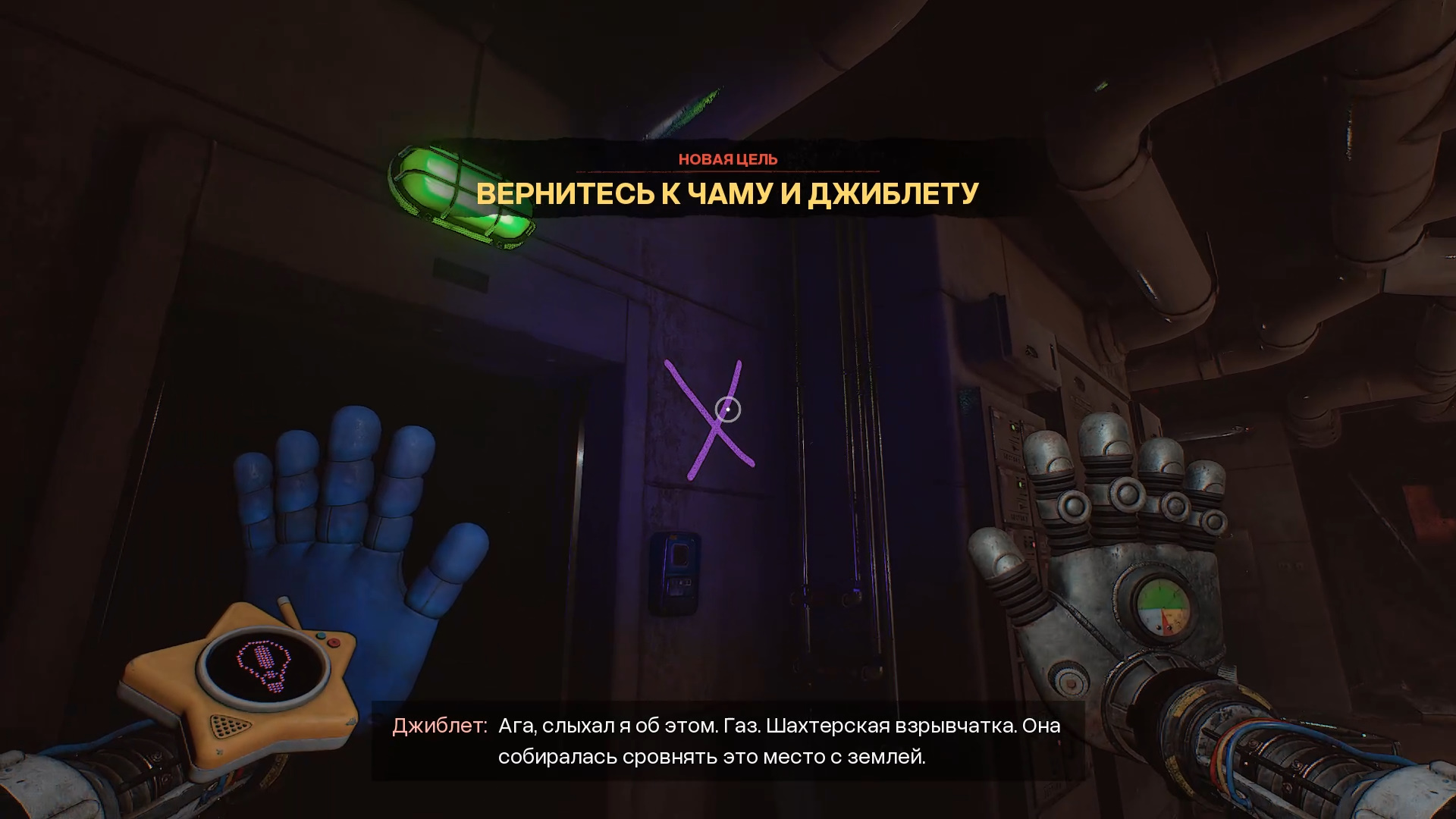 Через некоторое время персонажи уйдут, а цель обновится. Поднимайтесь по лестнице справа от двери, через которую они вышли. Впереди будет первое треснувшее стекло — разбейте его рукой-давилкой.