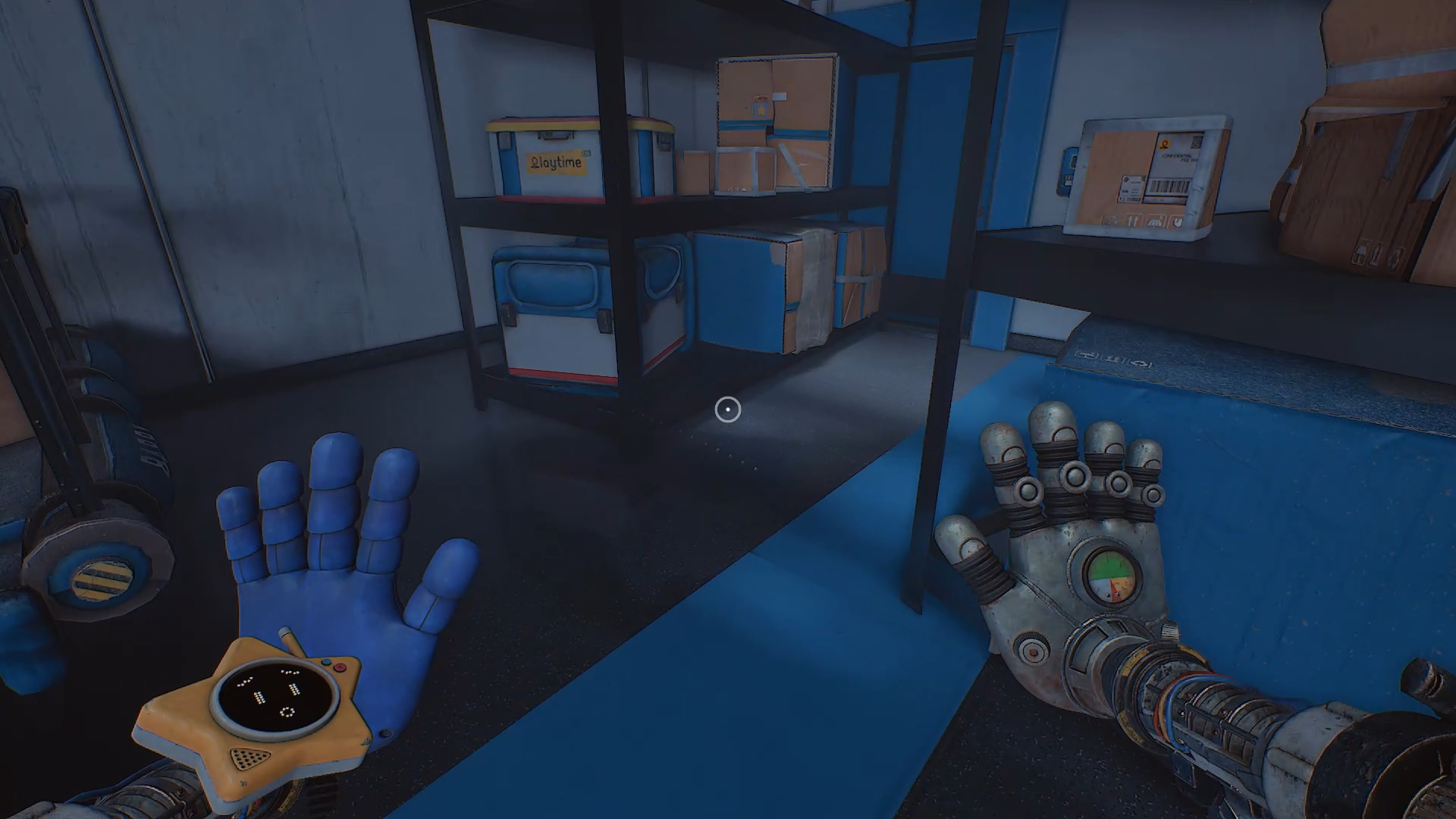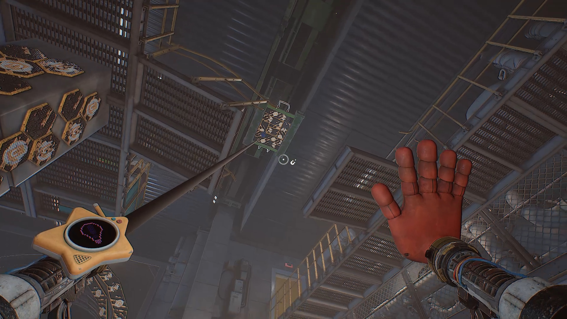 Оттолкните одну из коробок рукой-давилкой. Осмотрите стеллажи: часть номеров на ящиках видна только в ультрафиолете. Под потолком размещён ещё один блок с поручнями. Сдвиньте его в сторону сломанного мостика, туда же передвиньте красный ящик. Поднимитесь по поручню на ящик и перепрыгните на мостик.