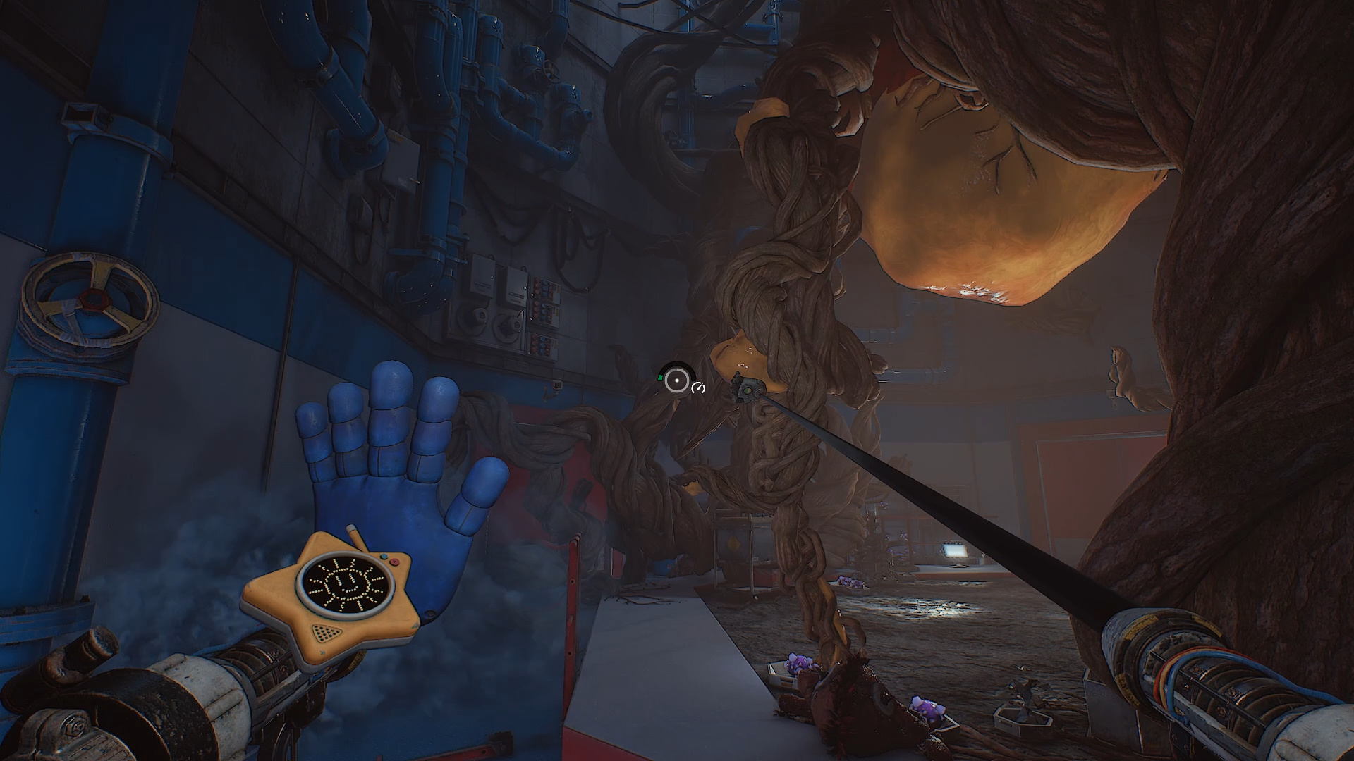 Пройдите в дверь справа. Внутри начинайте уничтожать многочисленные наросты. В некоторых местах из труб валит синий дым — его необходимо перекрывать, вращая соответствующие вентили. После того как вы уничтожите все наросты и сломаете три ветки, станет возможным разрушить самый крупный нарост в центре помещения. Это откроет путь дальше.