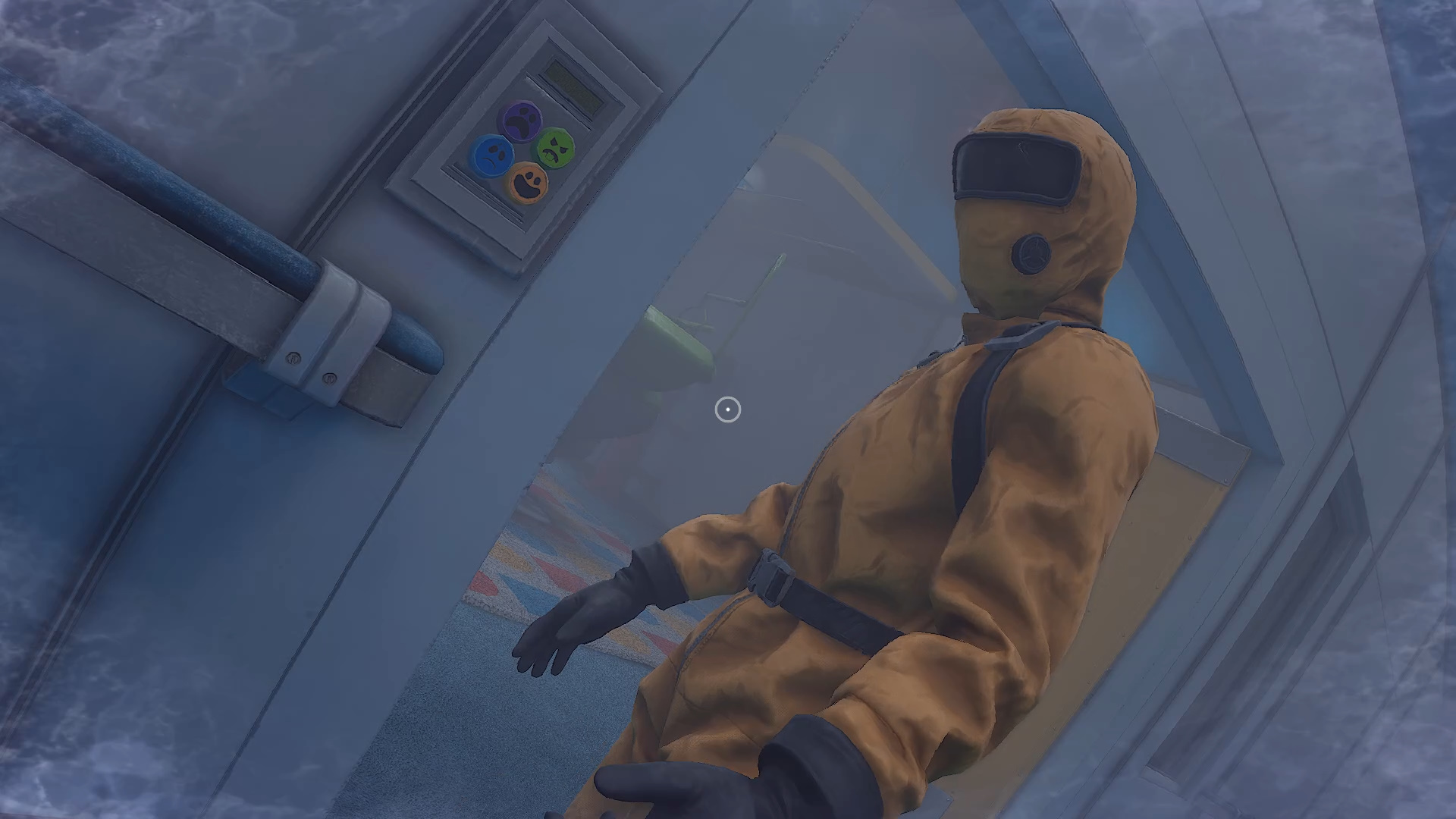 Внимательно наблюдайте за кат-сценой. Сотрудник в защитном костюме введет код, используя разноцветные кнопки со смайликами. Комбинация может быть случайной, но в моем прохождении она выглядела так: желтая, желтая, зеленая, синяя, фиолетовая, желтая.