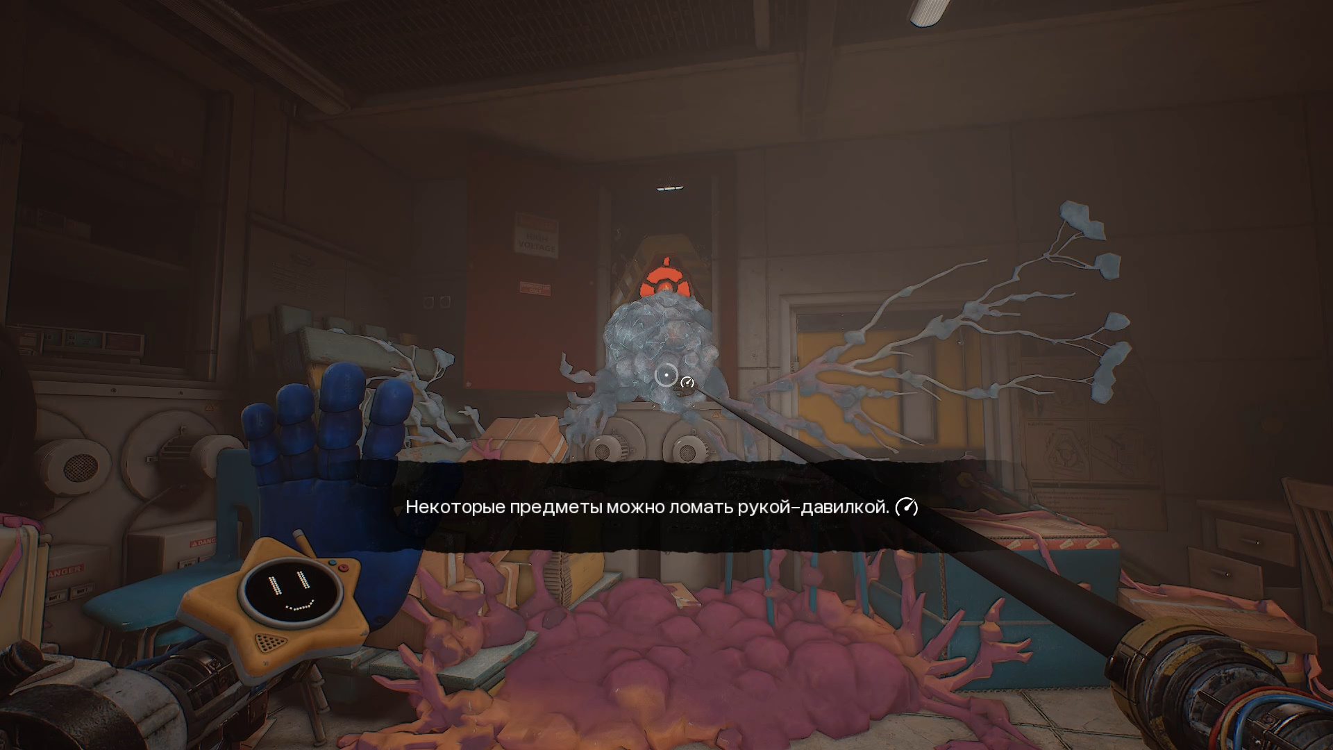 Поднявшись выше по лестнице, вы попадете в комнату, заполненную красным дымом. На полу лежит диск 2. Двигайтесь в конец коридора. Комната справа открыта, двери впереди приоткрыты. Используйте руку, чтобы распахнуть дальнюю красную дверь. Внутри находится огненная панель. Коснитесь ее желтой рукой, после чего войдите в комнату справа и найдите на столе под окном, ведущим в соседнее помещение, горелку. Сначала поверните вентиль для подачи газа, затем активируйте горелку огненной рукой. Взрыв создаст трещину, позволяющую разрушить стекло рукой-давилкой.