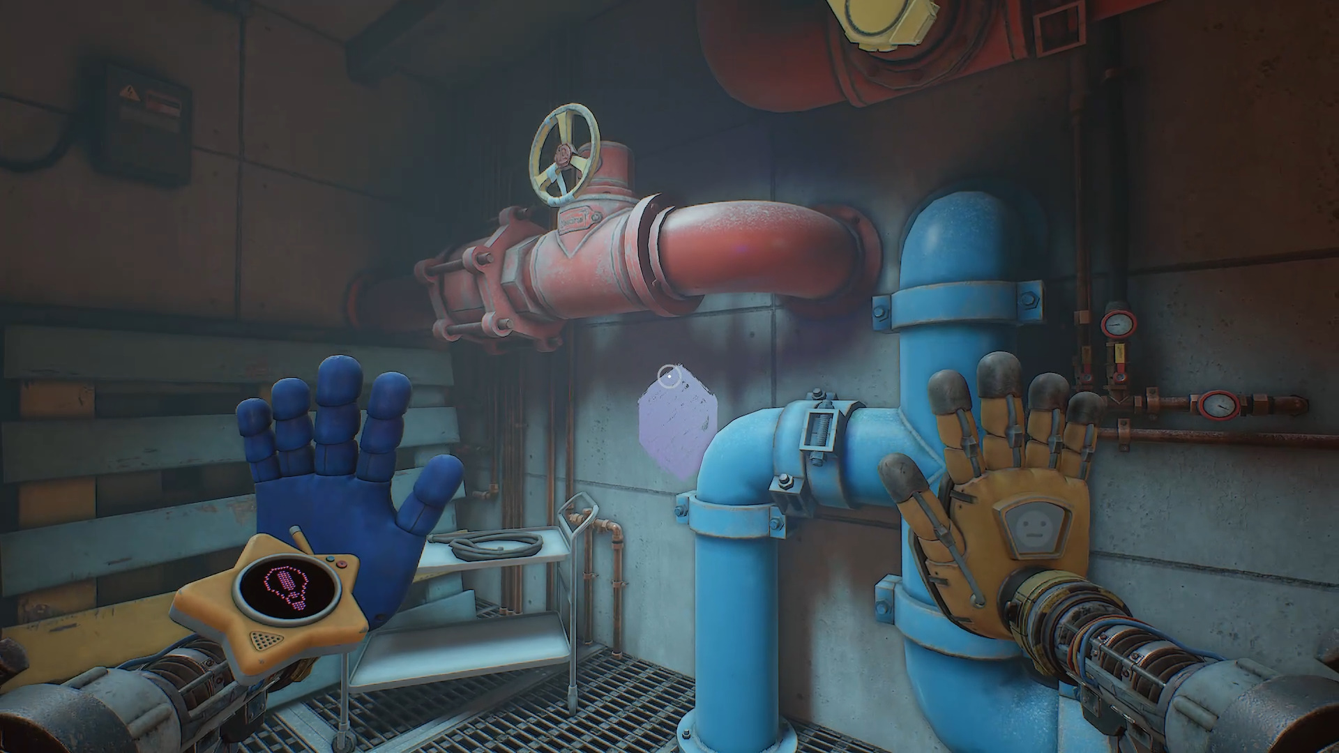 Желтая рука позволяет взаимодействовать с токопроводящими синими панелями, передающими электричество, огонь или холод.