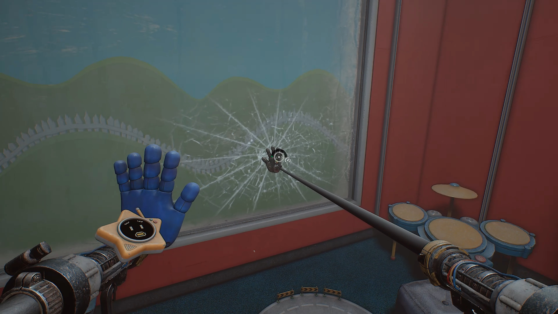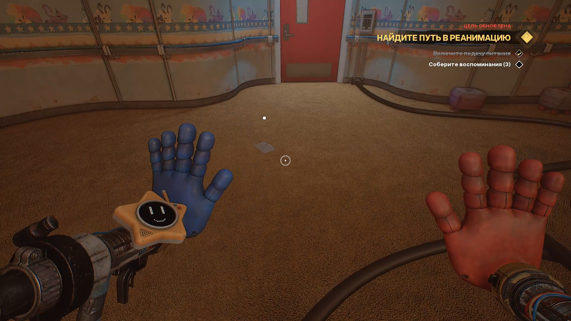 Доберитесь до самой первой комнаты — детской спальни с кроватками. Обратите внимание на трещину на стекле с изображением пейзажа. Разбейте стекло рукой-давилкой, чтобы попасть в реанимацию.
