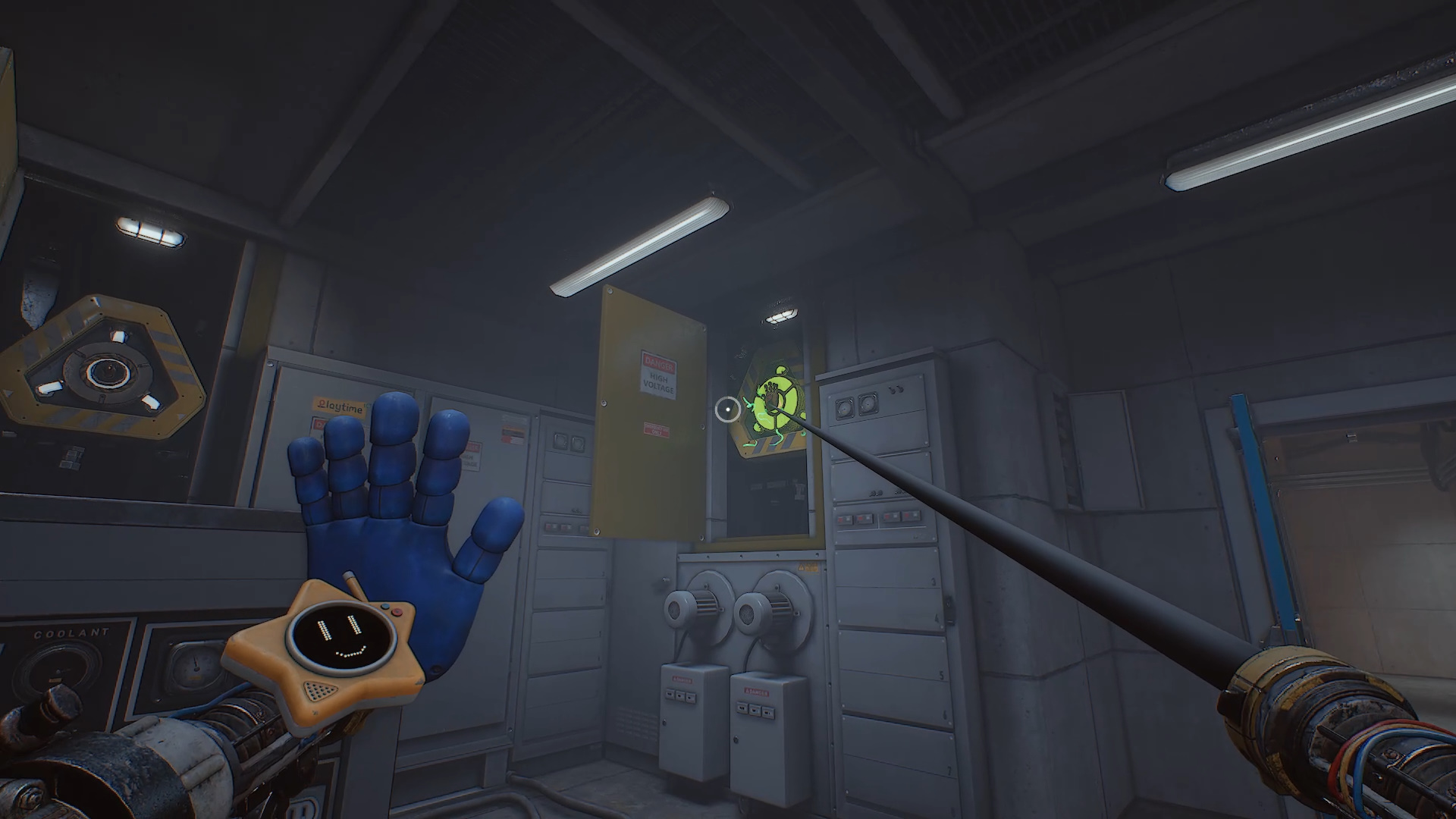 Пройдите дальше и откройте все желтые щитки — их четыре. За одним из них находится рабочая электрическая панель с зеленым индикатором. Запитайте желтую руку и поочередно передайте заряд в три оставшиеся панели. Для каждой панели потребуется отдельная подзарядка руки. Питание будет восстановлено.