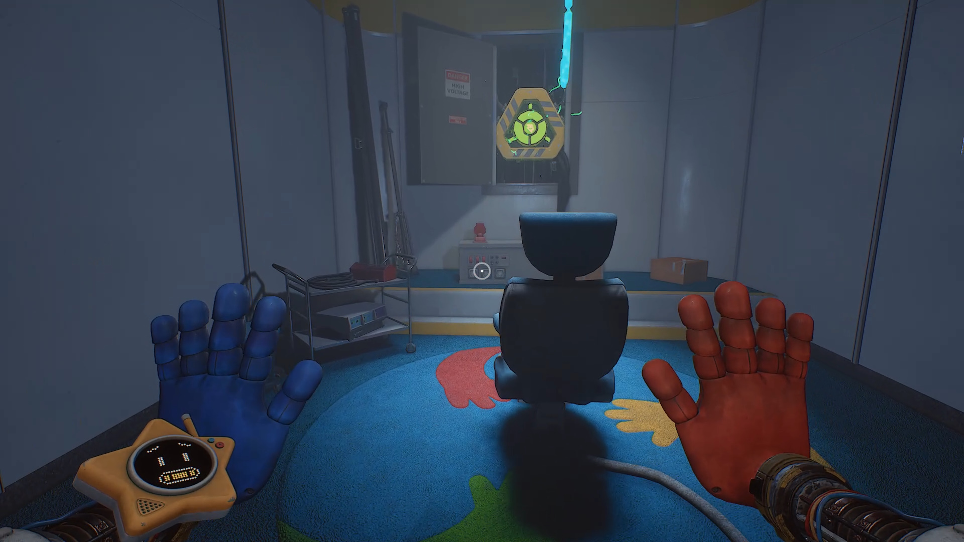 Вернитесь в коридор и в самом конце откройте красную дверь. В помещении используйте синюю и красную руки, чтобы перемещать батарею, лежащую на полу. Установите ее в комнате за желтой дверью, чтобы окончательно получить желтую руку.