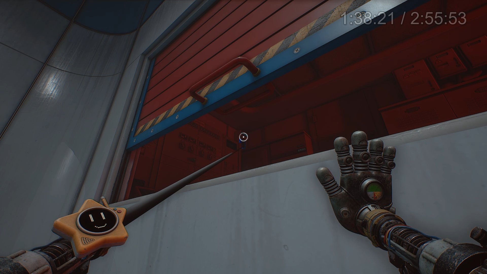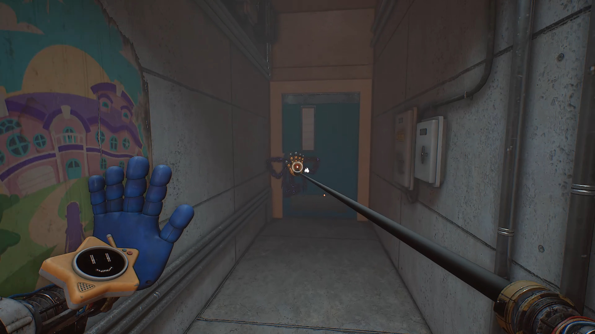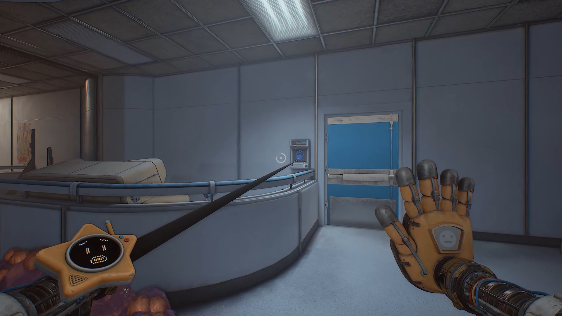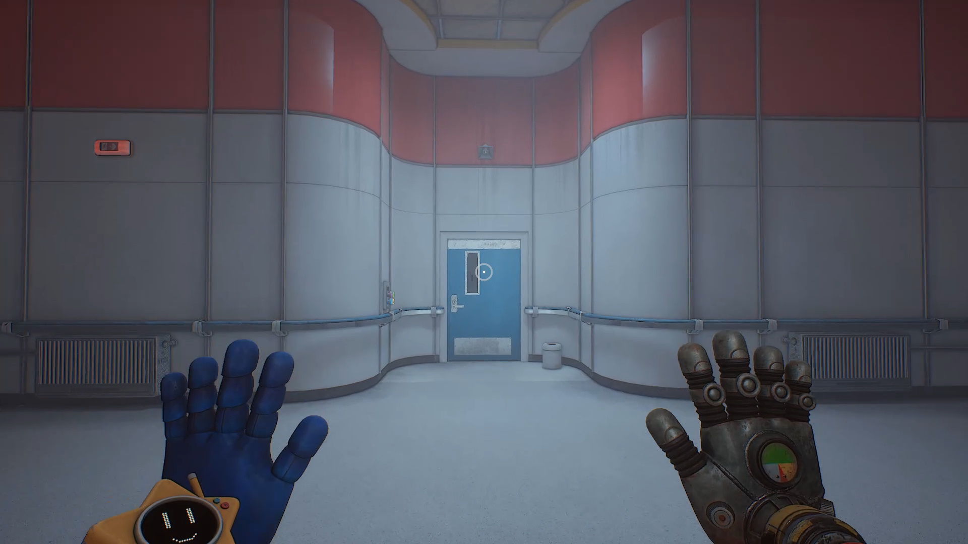 В левом дальнем углу находится синяя дверь с мигающей лампочкой сверху — войдите в нее. Коридор ведет к двум лифтам. Поверните налево, пройдите через еще одну синюю дверь и зайдите в желтую дверь справа. В этой комнате за стеклом слева находится новая желтая рука.