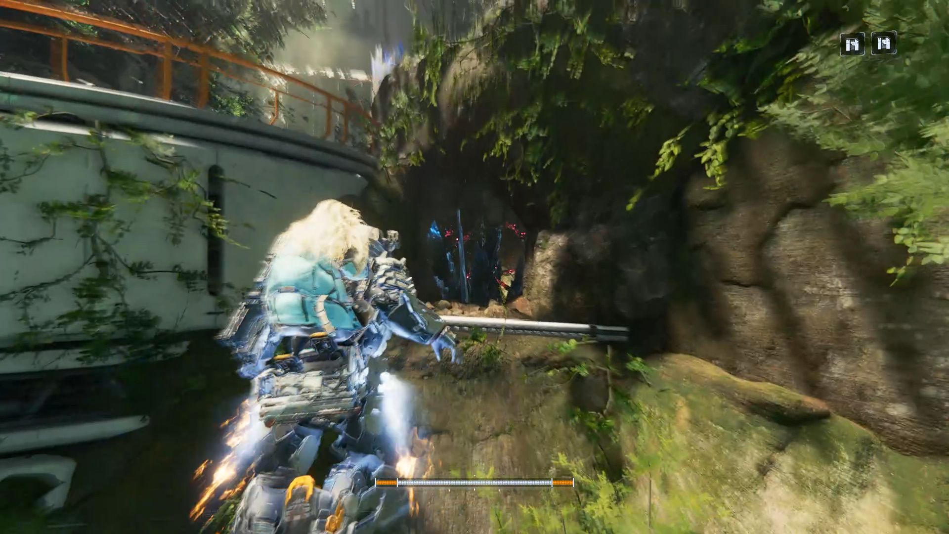 Бегите влево, чтобы обнаружить ступени. За ними и стеклом есть помещение с НЗИ. Победите робота, поднимитесь по ступеням, уничтожьте еще одного красного робота, чтобы обнаружить под деревом терминал со вторым чипом генерации.