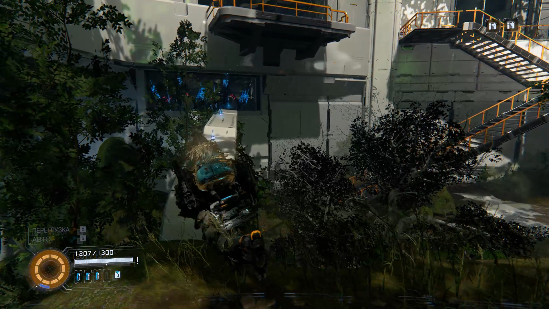 Правее есть вход в красную зону «Лаборатория экомоделирования». Если имеется красный ключ, посетите это место. Вам нужно подниматься вверх по деревьям, уничтожая врагов. Выпущенные дронами ракеты можно взламывать, чтобы направлять в обратную сторону. Сначала сходите в дальний угол на нижнем этаже, чтобы найти компоненты для улучшения. После поднимайтесь вверх. За дверью будет синий контейнер с модификацией «Пушечное мясо» и обычный с чистым лунитом.