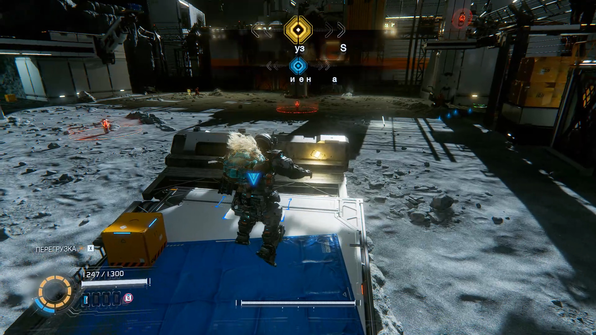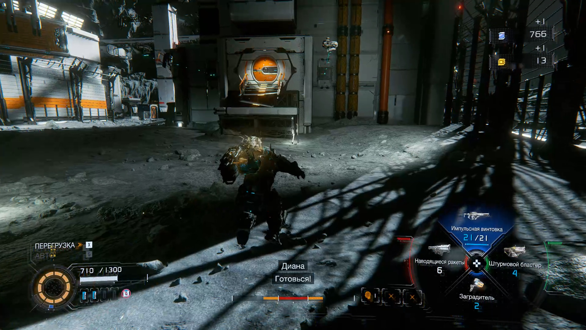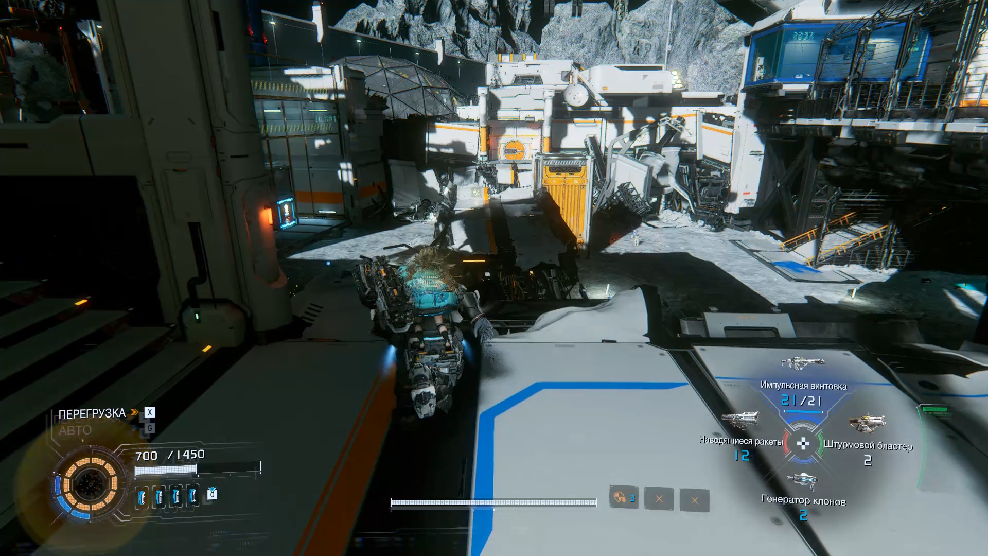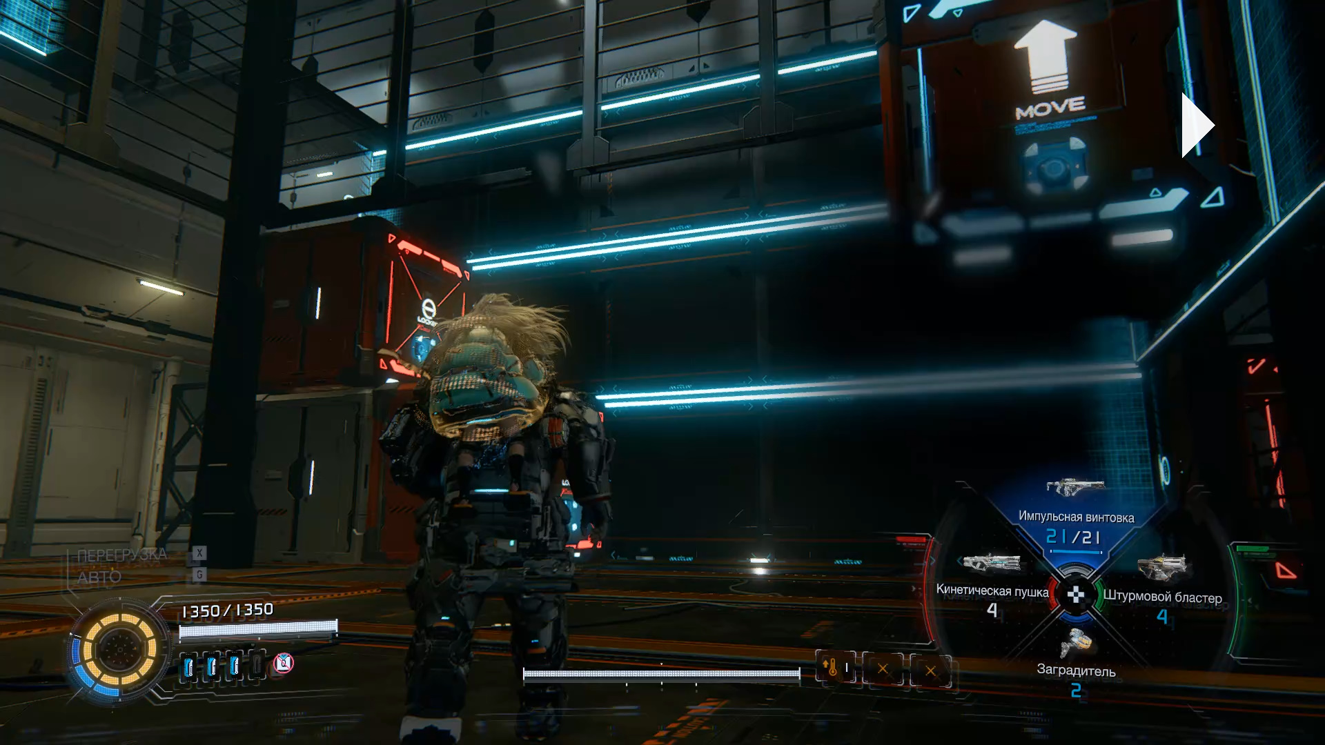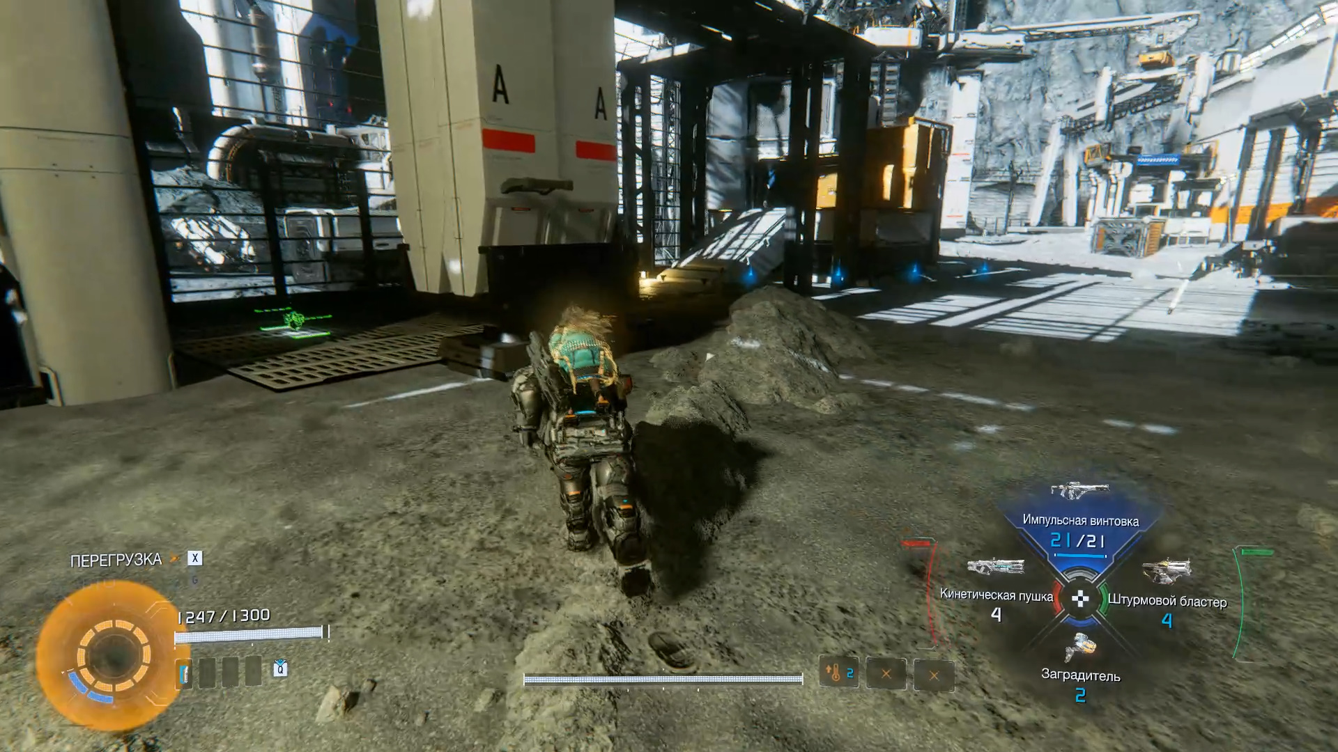 Подберите новое оружие «Заградитель». Устанавливается в защитный модуль. Выйдите наружу, чтобы вновь оказаться в поле с Лунокопом. За ящиками справа ищите компонент для улучшения. Бегите на белую платформу на противоположной стороне, где есть компонент для улучшения. Еще один компонент для улучшения ищите прямо в поле. На другой стороне запрыгните на ступени и войдите в здание.