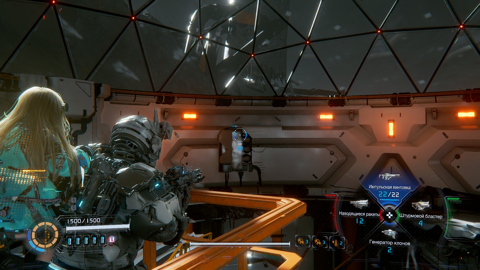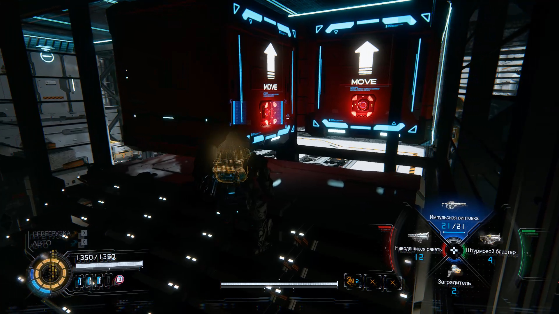 Чуть дальше подберите новое оружие — атакующий модуль «Наводящиеся ракеты». Спрыгните вниз и зачистите локацию от врагов. Взломайте красный узел на колонне A, чтобы опустить контейнер. В правом дальнем углу есть лув, сломав который, вы сможете найти компонент для улучшения. Также если запрыгнуть по паре возвышенностей в левой части локации, можно отыскать платформу с контейнером, содержащим 4 компонента для улучшения.