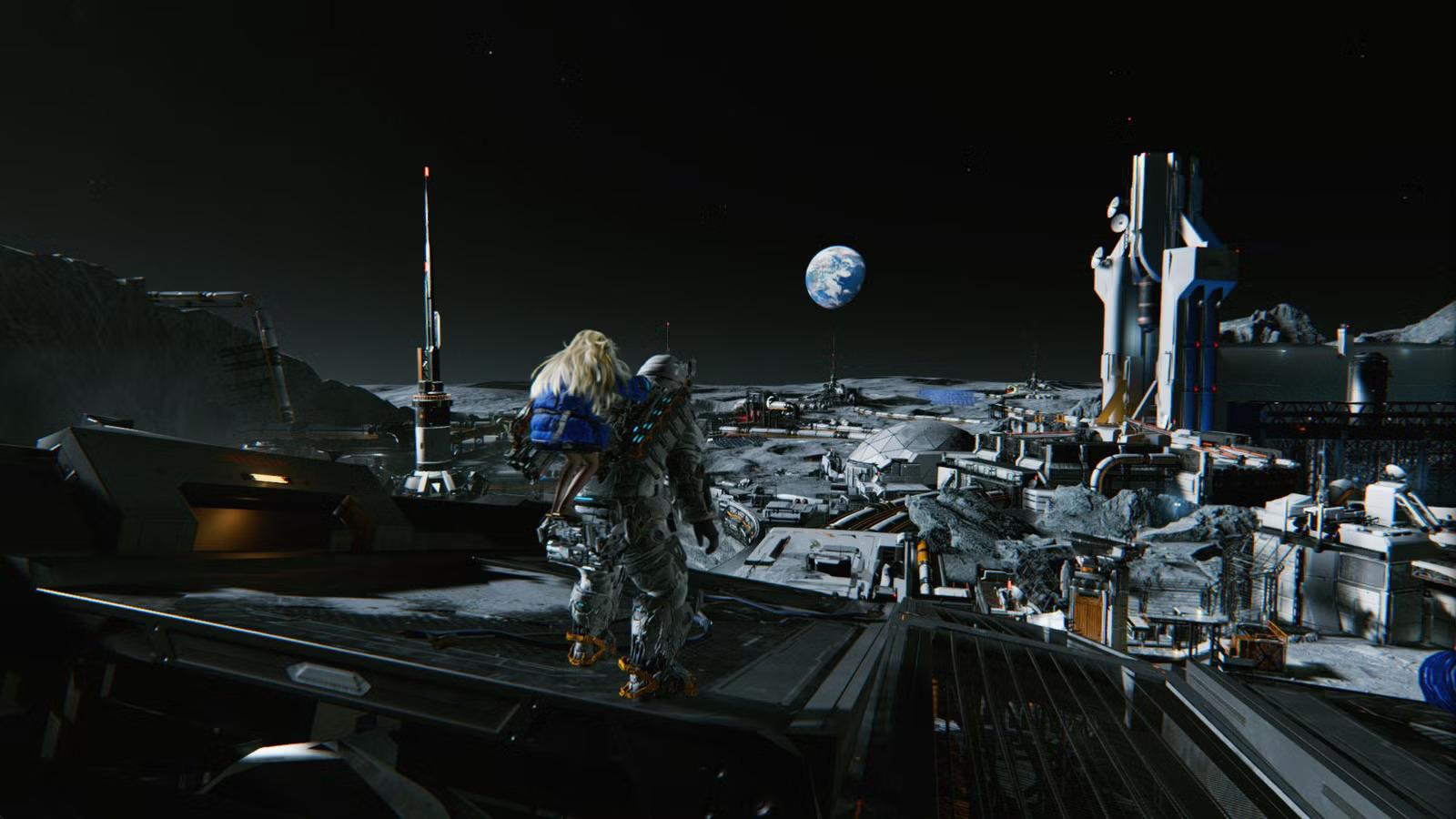 Пройдите через дверь, чтобы оказаться снаружи станции. Здесь действует лунная гравитация: вы будете прыгать выше, дольше лететь с ускорителями. Спрыгните в самый низ и на выступе слева ищите компонент для улучшения. Пройдите через помещение, чтобы вновь оказаться снаружи.